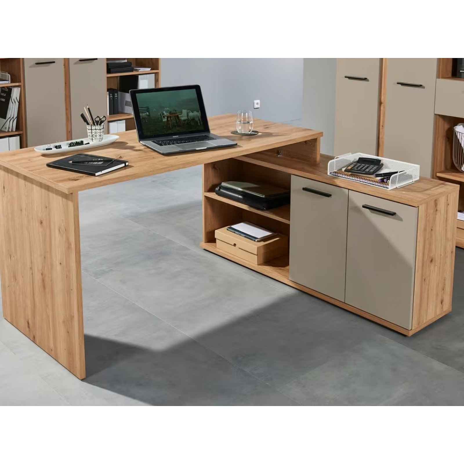 Rohový psací stůl s komodou z programu Kanada - moderní nábytek v kombinaci dřevodekoru dub artisan s kašmírově béžovými plochami vytvoří příjemné prostředí. Rohový psací stůl s komodou z programu Kanada – moderní nábytek v kombinaci dřevodekoru dub artisan s kašmírově béžovými plochami vytvoří příjemné prostředí, kde se budete cítit útulně. Díky odkládacím přihrádkám a úložným prostorům budete mít věci stále při ruce. Skříňku lze ke stolu univerzálně namontovat na pravou anebo levou stranu a přizpůsobit si tak nábytek podle prostoru. - rohový psací stůl z programu Kanada - materiál: laminovaná dřevotříska 16 mm/22 mm, kov, plast - dekor korpus: dub artisan - dekor přední plochy: dub artisan/kašmírová béžová mat - úchyt: plast, černé - nožky: kulaté kluzáky, plast, černé - mechanismus Soft Close: tlumené dovírání dveří - rohová sestava obsahuje: psací stůl + boční úložná skříňka - univerzální montáž stolu jako pravý/levý roh: skříňka umístěná vpravo nebo skříňka umístěna vlevo - celkové rozměry rohové sestavy: 161x74x130 cm - rozměry samotného stolu: 138x74x65 cm (pracovní plocha stolu 138×65 cm, síla desky 22 mm) - rozměry samotné boční skříňky: 130x60x38 cm - psací stůl pevně ukotven ke skříňce - boční skříňka: 2 x otevřená přihrádka (1 x police), 2 x otočné dveře (úložný prostor, 1 x police) - psací stůl a skříňku nelze rozmístit samostatně (vždy tvoří sestavu) - moderní rovné linie - stabilní konstrukce - dodáváno v demontu