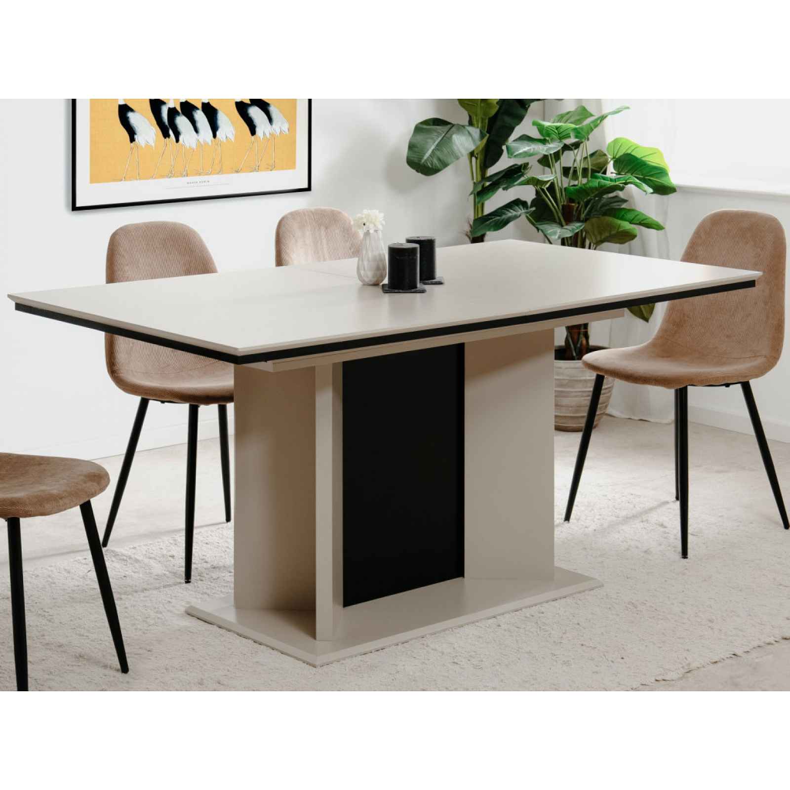 Prostorný jídelní stůl o velikosti 160x90 cm má moderní design s výraznou středovou podnoží, která stolu dodává stabilitu. Tento stůl můžete snadno rozložit. Prostorný jídelní stůl o velikosti 160x90 cm má moderní design s výraznou středovou podnoží, která stolu dodává stabilitu. Tento stůl můžete snadno rozložit na šířku 200 cm a usadit tak ke stolu více přítel anebo širší rodinu. Stůl je vyroben v kombinaci béžová cappuccino/černá a snadno si ho oblíbíte pro jeho moderní styl i praktičnost. - materiál: laminovaná dřevotříska 16 mm/38 mm (ABS hrany), kov - dekor: béžová cappuccino mat/černá mat - obdélná základna: 90×50 cm - členitá středová podnož - obdélná jídelní deska: plocha 160×90 cm - síla jídelní desky: 36 mm (s ABS hranou) - podhledové boční lišty - funkce rozkladu: 1 x přídavná středová deska (šířka 40 cm) – přiložením přídavné středové desky se původní 160 cm šířka stolu zvětší na 200 cm (kovové pojezdy, aretační páčky, přídavná deska uložena do středové lišty) - volná výška pod jídelní deskou: cca 72 cm - zajímavý moderní design - stabilní konstrukce - dodáváno v demontu
