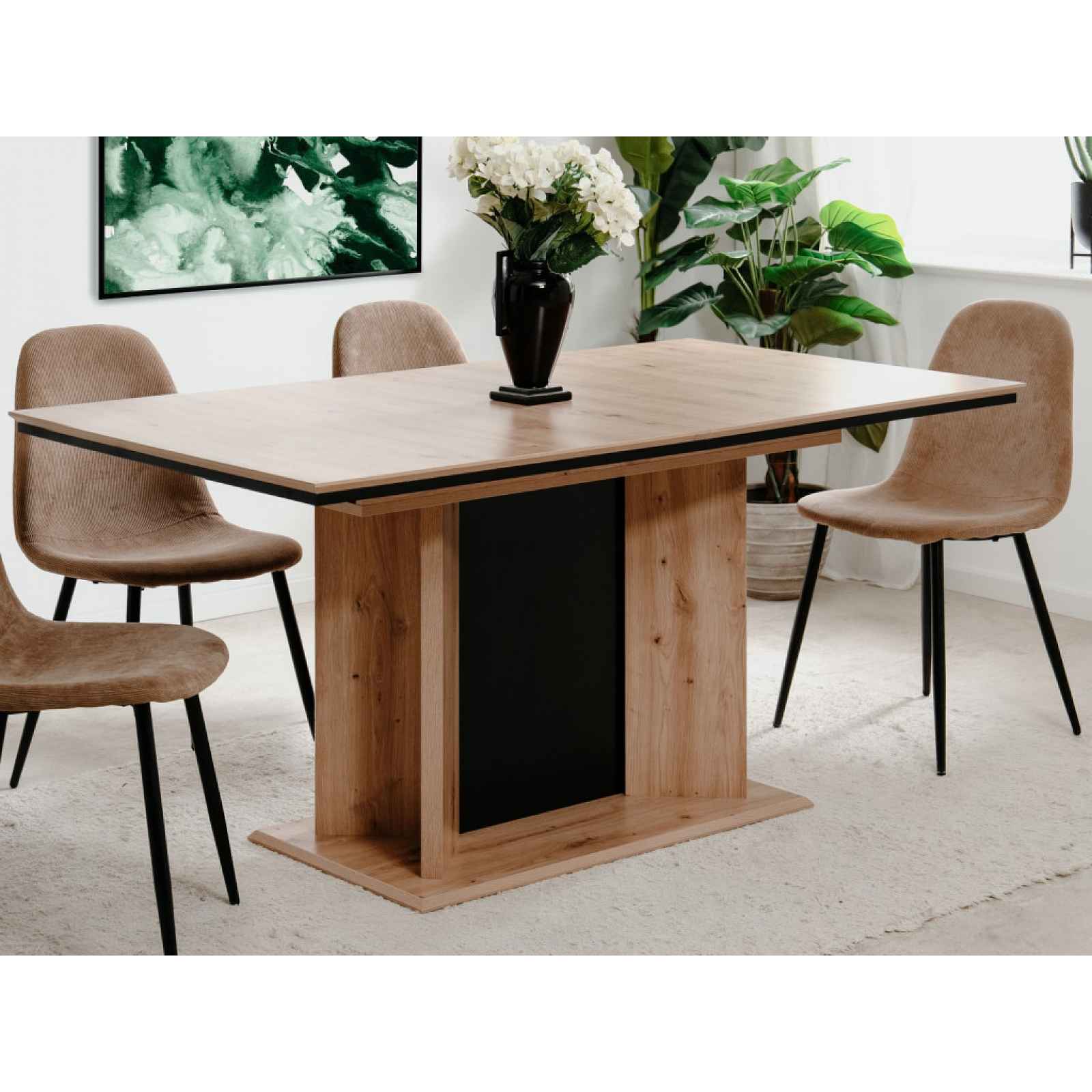 Prostorný jídelní stůl o velikosti 160x90 cm má moderní design s výraznou středovou podnoží, která stolu dodává stabilitu. Tento stůl můžete snadno rozložit. Prostorný jídelní stůl o velikosti 160x90 cm má moderní design s výraznou středovou podnoží, která stolu dodává stabilitu. Tento stůl můžete snadno rozložit na šířku 200 cm a usadit tak ke stolu více přítel anebo širší rodinu. Stůl je vyroben v kombinaci dub artisan/černý a snadno si ho oblíbíte pro jeho moderní styl i praktičnost. - materiál: laminovaná dřevotříska 16 mm/38 mm (ABS hrany), kov - dekor: dub artisan/černá mat - obdélná základna: 90×50 cm - členitá středová podnož - obdélná jídelní deska: plocha 160×90 cm - síla jídelní desky: 36 mm (s ABS hranou) - podhledové boční lišty - funkce rozkladu: 1 x přídavná středová deska (šířka 40 cm) – přiložením přídavné středové desky se původní 160 cm šířka stolu zvětší na 200 cm (kovové pojezdy, aretační páčky, přídavná deska uložena do středové lišty) - volná výška pod jídelní deskou: cca 72 cm - zajímavý moderní design - stabilní konstrukce - dodáváno v demontu