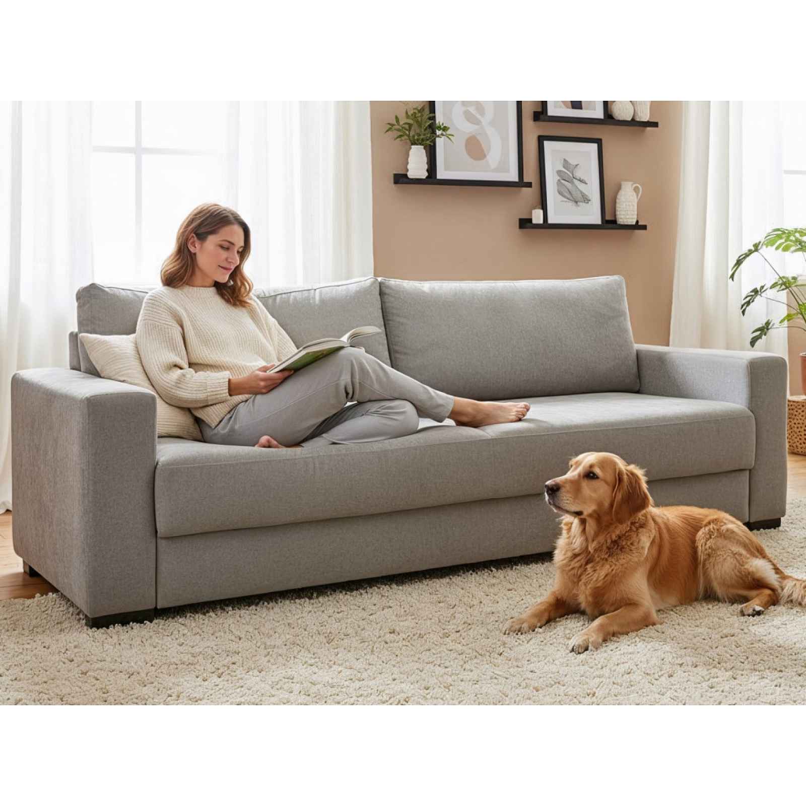 Široká nadčasová pohovka je prostorná, pohodlná a zároveň praktická. Nabízí rozkládací funkci na příležitostné lůžko i úložný prostor pod sedákem. Široká nadčasová pohovka je prostorná, pohodlná a zároveň praktická. Očalouněna látkou v barvě holubí šedá a doplněna bočním proševem na područkách. Nabízí rozkládací funkci na příležitostné lůžko i úložný prostor pod sedákem, kam snadno uschováte například deky, lůžkoviny nebo třeba věci sezónní potřeby. Trojmístná pohovka bude skvěle pasovat nejen do obýváku, ale prakticky poslouží i třeba v pokoji pro hosty. Prostorný sedák a velké opěrné polštáře poskytnou příjemné pohodlí během každého dne. - konstrukce: dřevo, dřevotříska, překližka, kov - jádro: vlnovcové pružiny, polyuretanové pěny, čalounický flís - potah korpus/polštáře: látka Flow 23 - jemně strukturovaná žinilková látka, barva holubí šedá (složení: 100% polyester, otěruvzdornost: 70.000 cyklů) - včetně potažení zadní části (možné umístění i v prostoru) - prošev potahu vnější strany područek - 2 x velký opěrný polštář (snímatelný potah na zip, rozměr polštáře cca 103x44 cm) - levá/pravá boční područka - sedák: měkčí komfort, prostorný - opěrák: velké opěrné polštáře, středně měkké - výška pohovky včetně polštářů: 86 cm/bez polštářů: 77 cm - výška sedu: 43 cm - hloubka sedu včetně polštářů: 55 cm/hloubka sedu bez polštářů: 78 cm - nohy: plast, černé, výška 5 cm - funkce rozkladu na příležitostné lůžko: plocha 146×197 cm (sklápěcí typ rozkladu – příležitostné lůžko snadno vznikne po vysunutí sedáku vpřed a sklopení opěráku) - úložný prostor (pod sedákem, vnitřní rozměry 193x23x59) - nadčasový styl do každého interieru - dodáváno v částečném demontu