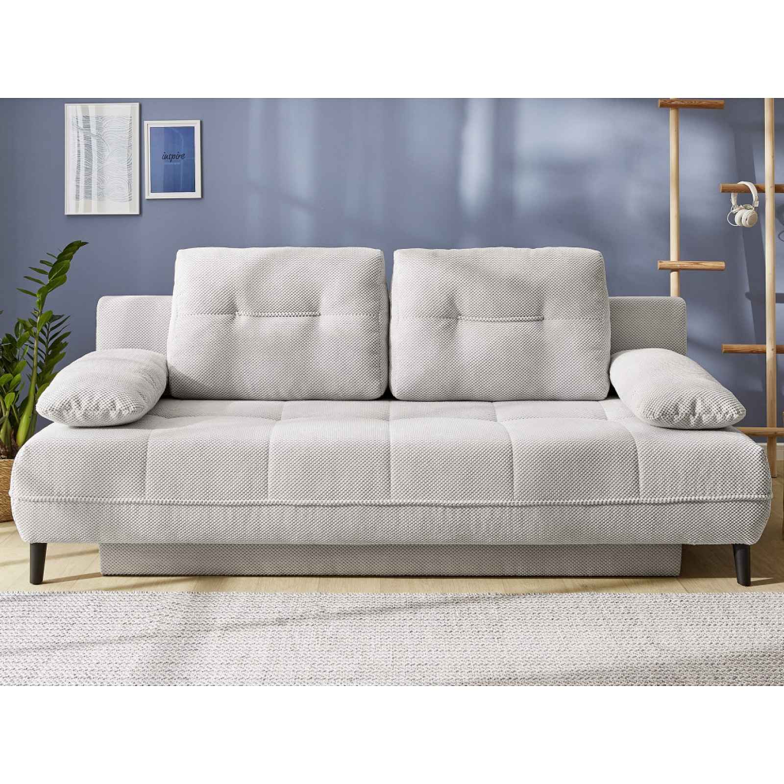Elegantní rozkládací pohovka se zaoblenými tvary a polštáři v šedo-béžové látce s výraznou vaflovou strukturou. Má úložný prostor a praktické lůžko. Pohodlná pohovka se zaoblenými tvary a polštáři se hodí nejen do prostoru obýváku – díky rozkládací funkci na příležitostné lůžko ji využijete v jakékoliv místnosti vašeho bytu. Tato kompaktní pohovka je očalouněna měkoučkou látkou s výraznou vaflovou strukturou v barvě šedo-béžová. Pod sedákem se ukrývá úložný prostor na drobné prádlo, lůžkoviny anebo věci sezónní potřeby. Černé kovové nohy dotvářejí stylový design. - konstrukce: dřevo, dřevotříska, překližka, kov - jádro: bonelové pružiny, polyuretanové pěna - potah: výrazná strukturovaná látka s vaflovým vzorem, barva světle šedo-béžová (složení: 95% polyester, 5% nylon, otěruvzdornost: 25.000 cyklů) - včetně potažení zadní části (možné umístění i v prostoru) - 2 x opěrný polštář - 2 x boční polštář - zaoblené tvary - sedák: středně měkký - opěrák: opěrné polštáře (měkčí) - výška sedu: 42 cm - hloubka sedu s polštáři: 54 cm/bez polštářů: 77 cm - šířka sedáku: 199 cm - výška s polštáři: 88 cm/bez polštářů: 73 cm - nohy: kov, černé, výška 12 cm (vhodné pro robotické vysavače) - funkce rozkladu na lůžko: plocha 140x199 cm (pro příležitostné spaní, výsuvný typ rozkladu – příležitostné lůžko snadno vznikne po vysunutí sedáku vpřed a sklopení opěráku) - úložný prostor (pod sedákem, velikost cca 157x22x59 cm) - elegantní styl - doporučená nosnost do 110 kg/sedák - dodáváno v částečném demontu