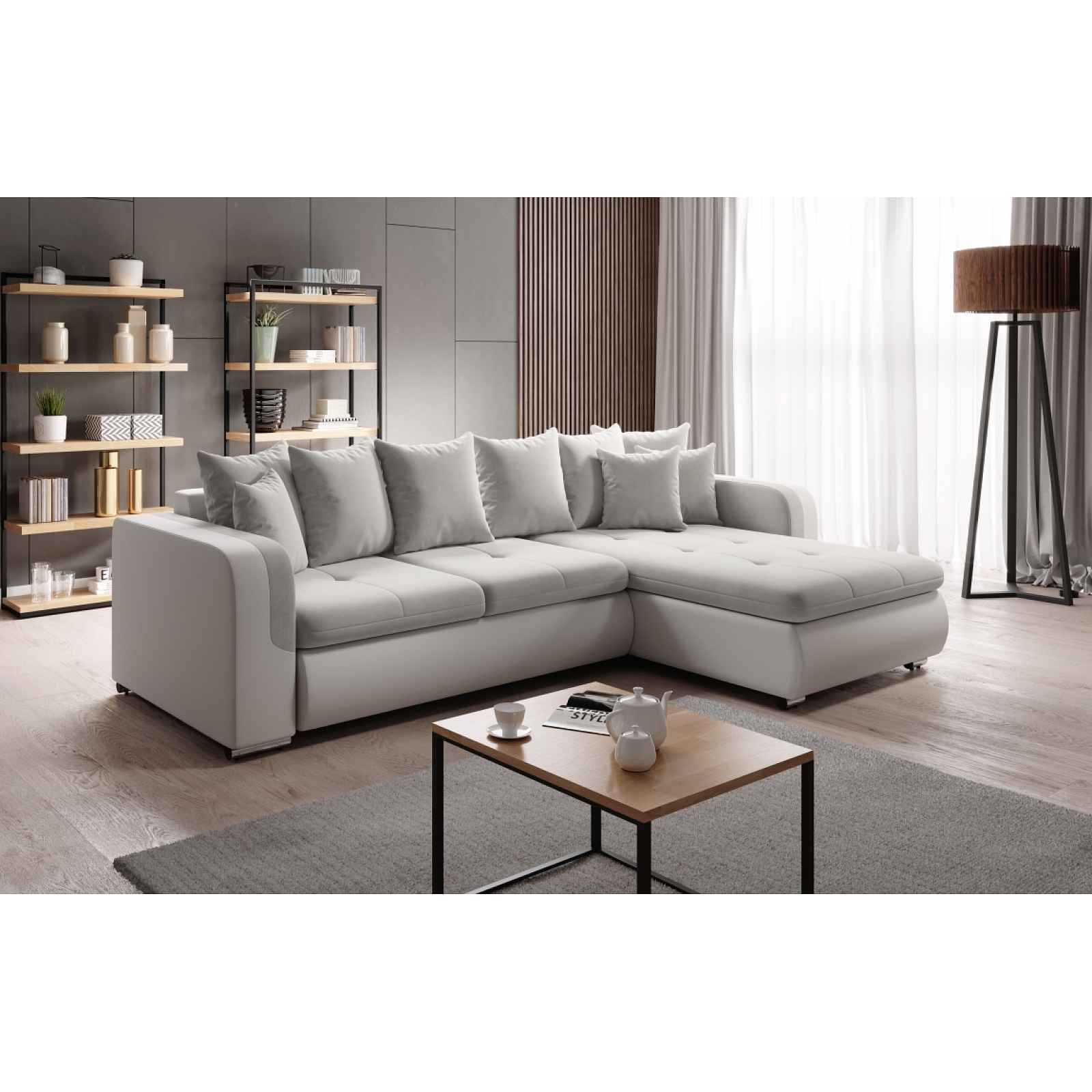 Rozkládací rohová sedačka, pravá Potahová látka: milo 25 = světle šedá látka/madryt 120 = bílá ekokůže Součástí jsou polštáře se zapínáním na zip. Celočalouněná, vhodná do prostoru. Rozměr (šxvxh): 270 x 76 (67 cm bez polštářů) x 162 cm Ložná plocha (šxh): 225 x 134 cmVýška sedu: 42 cmHloubka sedu: s polštáři 48 cm, bez polštářů 63 cm Materiál: pružina vlnitá, owata, polyuretanová pěna T30 Nohy kovové chromované. Dodáváno v demontu. Záruka 24 měsíců.