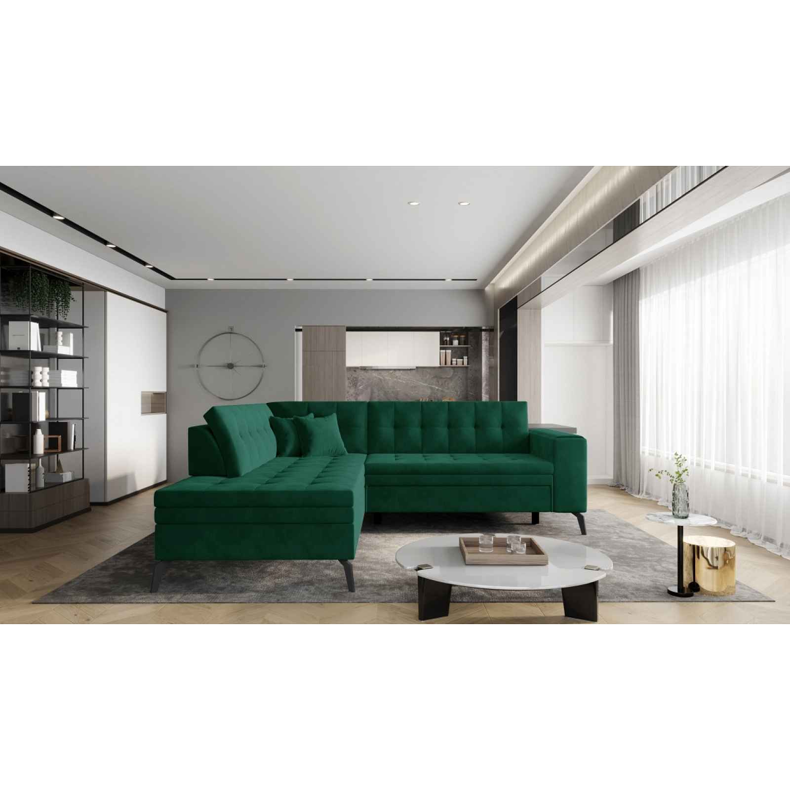 Rozkládací rohová sedačka, levá Skutečná francouzská elegance! Rohová sedačka splní očekávání i těch nejnáročnějších uživatelů. Díky svým značným rozměrům skvěle zapadne do každého interiéru, mnoha stylů. Výjimečný komfort zajišťuje kombinace vlnité pružiny s inovativní pěnou T30. Materiál je odolný vůči všem druhům deformací a promáčknutí. Díky takové technice bude sedačka jistě jedinečným kusem nábytku, který vám bude sloužit roky! Kdykoli - díky systému delfín - snadno a intuitivně přeměníte pohodlnou sedačku na prostornou postel. Takhle vypadá dokonalý odpočinek. Dokonalé dokončovací prvky nábytku - atmosférické prošívání, prostorný sedák a zajímavé nohy z kovu a plastu. Všechny tyto prvky znamenají, že kromě funkčního kusu nábytku máte ve svém bytě i skutečnou dekoraci obývacího pokoje. Obrázky s rozměry, detaily a funkcemi jsou pouze ilustrativní (jiná barva). Barva potahové látky: lukso 35 = zelená látka Rozměr (šxvxh): 260 x 93 x 210 cm Plocha na spaní (šxh): 195 x 125 cm Hloubka sedu: 58 cm Výška sedu: 47 cmVýška nožek: 13 cm Materiál: - vlnitá pružina, pěna T3040 (sed), pěna T2542 (zádová opěrka) - nožky: plast, kov Dodáváno v demontu. Rozměry balíků: 1. 208 x 97 x 76 cm; 69,5 kg 2. 169 x 96 x 76 cm; 72,5 kg