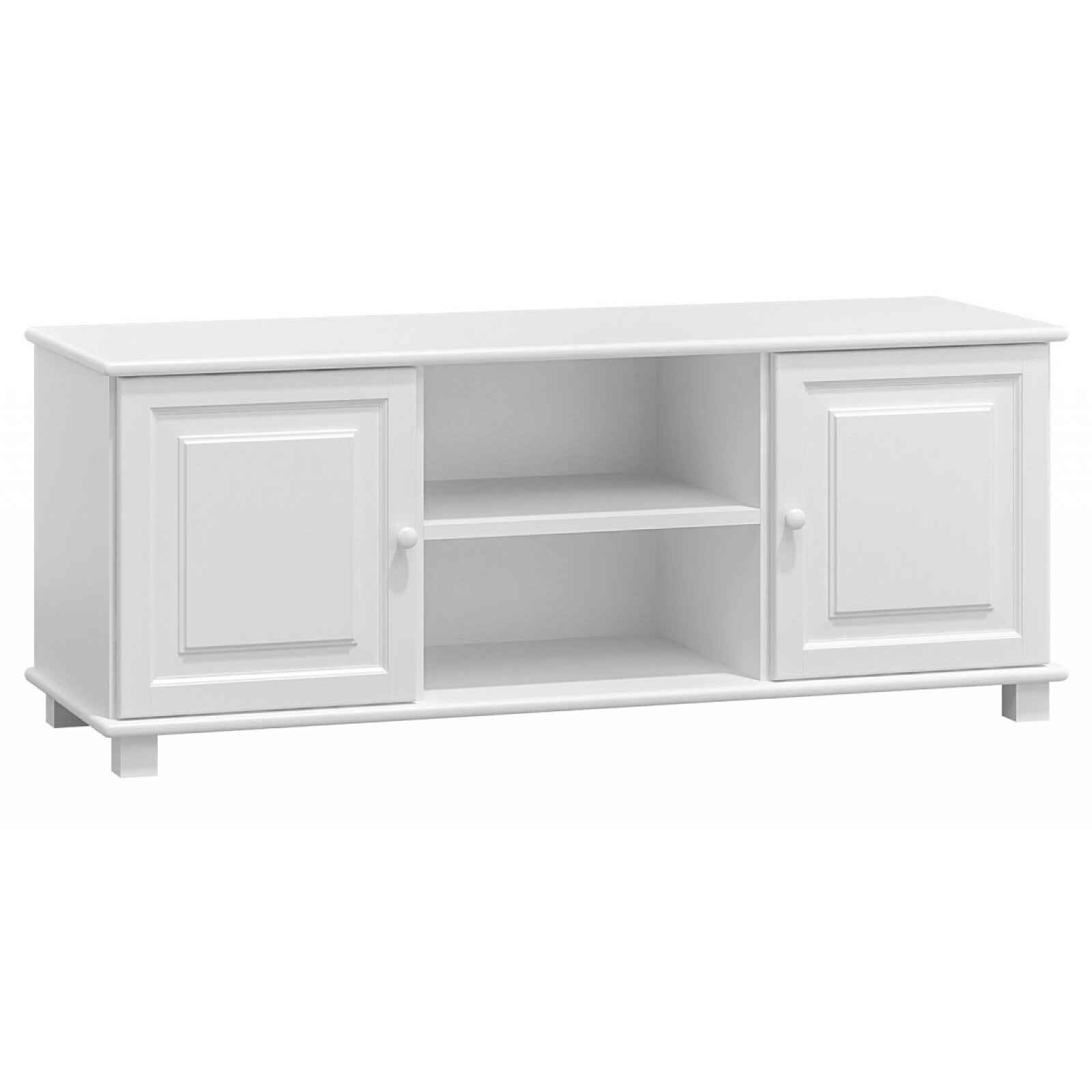 Televizní stolek se dvěma dvířky Materiál: masiv borovice Barva moření: bílá Rozměry (výška x šířka x hloubka): 55 x 118 x 47 cm Dodáváno v demontu.