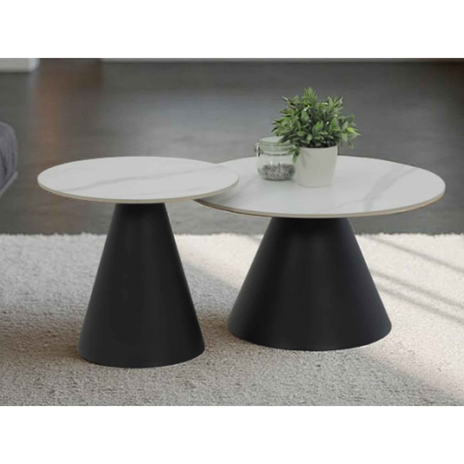 Sada obsahuje 2 různě velké kulaté stolky o průměru 70 cm a 50 cm. Mají moderní design podle top aktuálních trendů a perfektně doplní moderní prostor obýváku. Tato sada obsahuje 2 různě velké kulaté stolky o průměru 70 cm a 50 cm. Stolky mají moderní design podle top aktuálních trendů a perfektně doplní moderní prostor vašeho obýváku. Kulaté stolky jsou vyrobeny v imitaci bílého mramoru v kombinaci s černou kovovou konstrukcí ve tvaru kuželu. Stolky lze využít jako společnou kompozici anebo samostatně – větší stolek můžete umístít k sedaččce a menší stolek například vedle sedačky pro odkládání věcí anebo kamkoliv do rohu místnosti pro umístění stolní lampičky, sochy či kytky. Záleží jen na vašem vlastním vkusu a prostorových možnostech jak s těmito stylovými stolky vynaložíte. - sada obsahuje: větší stolek + menší stolek - podnož: kov, tvar kuželu - povrchová úprava: černý matný lak - horní plocha: slinutý kámen 12 mm - dekor: imitace bílý mramor (matný rovný povrch) - tvar: kulatý - větší stolek: průměr 70 cm/výška 40 cm - menší stolek: průměr 50 cm/výška 46 cm - umístění společně vedle sebe anebo samostatně v prostoru - moderní design - top trendy styl - stabilní - dodáváno v demontu