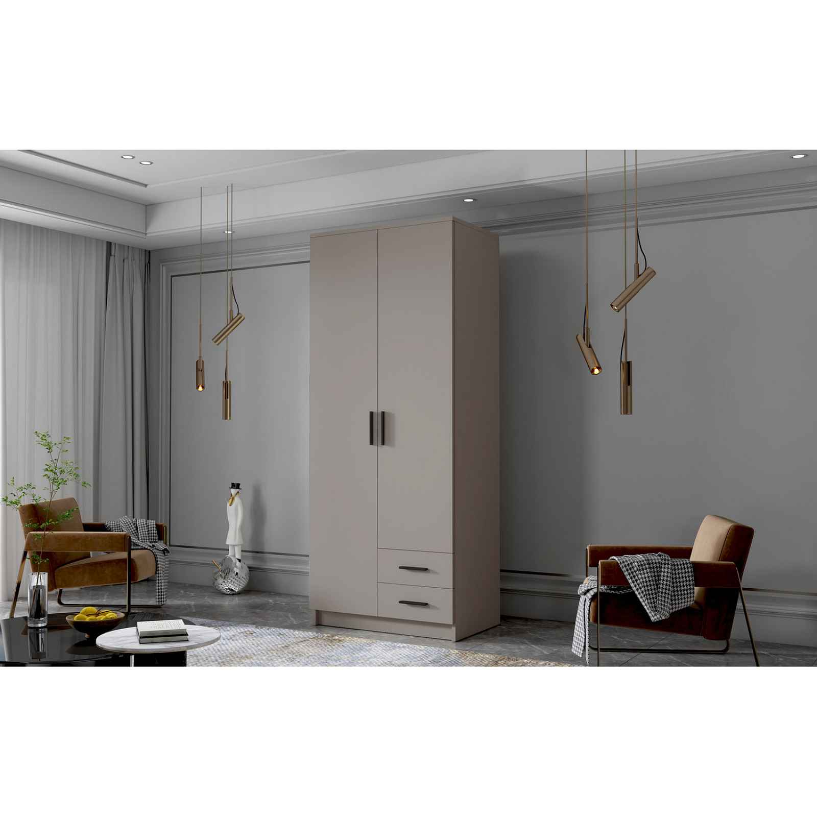 Šatní skříň ADA I 80 cm - béžová/černé úchytky. Šatní skříň kombinuje klasickou jednoduchost a moderní design. Je ideální jako šatní skříň do předsíně nebo místo pro uložení oblečení v ložnici nebo jiných drobností každodenní potřeby. Šatní skříně je rozdělena na dvě části. Na jedné straně jsou police a dvě zásuvky, a na druhé straně je závěsná šatní tyč a police. - použití kvalitních materiálů - zajímavé provedení - snadná montáž - zajímavé úchytky Údržba: Povrch nábytku utřete do čista měkkým hadříkem. Vyhněte se použití chemikálií.