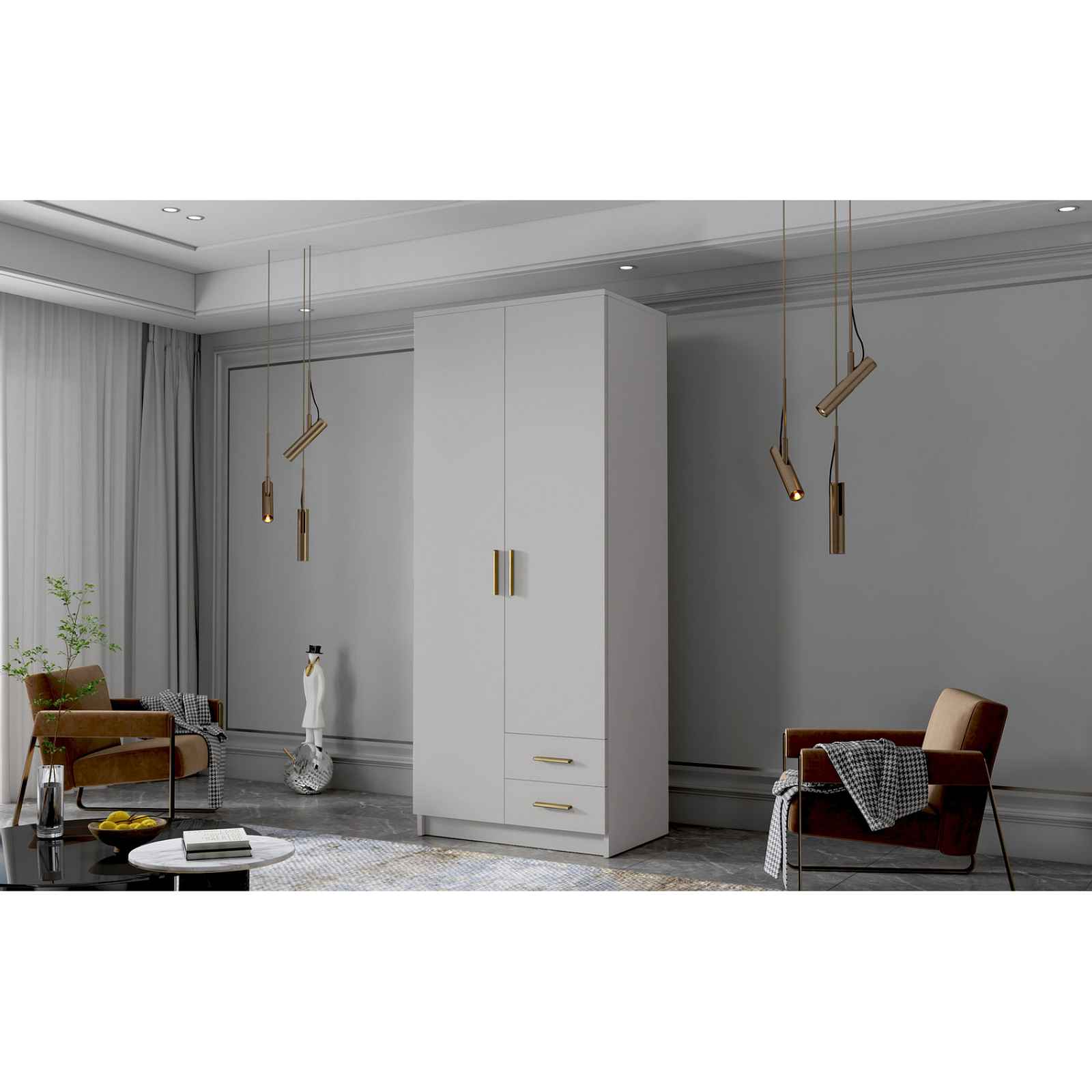 Šatní skříň ADA I 80 cm - bílá/zlaté úchytky. Šatní skříň kombinuje klasickou jednoduchost a moderní design. Je ideální jako šatní skříň do předsíně nebo místo pro uložení oblečení v ložnici nebo jiných drobností každodenní potřeby. Šatní skříně je rozdělena na dvě části. Na jedné straně jsou police a dvě zásuvky, a na druhé straně je závěsná šatní tyč a police - použití kvalitních materiálů - zajímavé provedení - snadná montáž - zajímavé úchytky Údržba: Povrch nábytku utřete do čista měkkým hadříkem. Vyhněte se použití chemikálií.