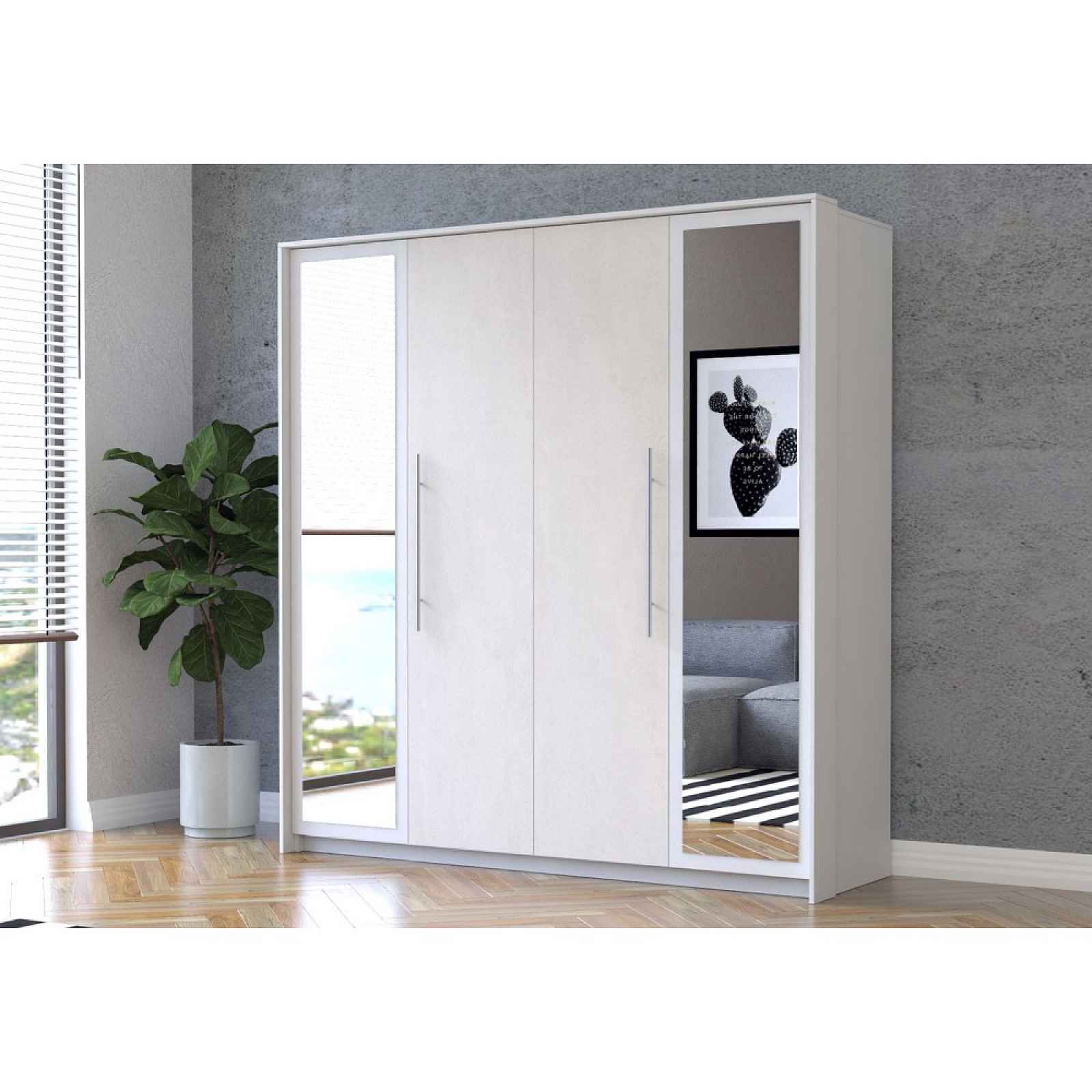 Velká šatní skříň Agáta dodáváme v dekoru bílá/silk(hedvábný) Vnitřní uspořádání viz. další fotografie Nábytek je dodáván v demontu skříň obsahuje zrcadlo vysoce kvalitní laminovaná deska o tloušťce 16 mm hrany kompletně zakončeny ABS dýhou Parametry: (šířka x výška x hloubka) 206x215x64cm