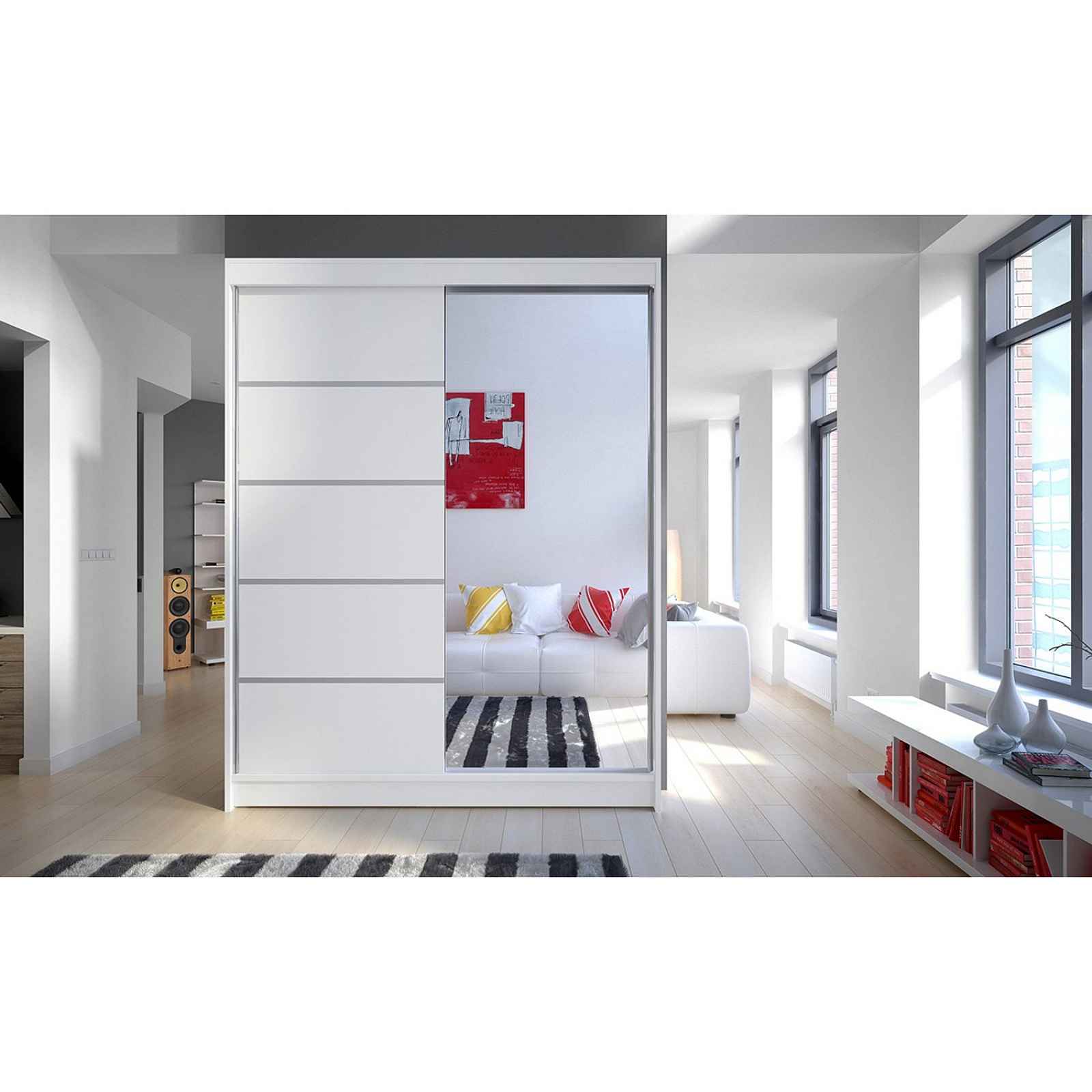 Prostorná šatní skříň Camino III je vyrobena v moderním designu a nabízí velké množství praktického úložného prostoru (viz obrázek). Neocenitelný je systém trendových posuvných dveří se zrcadlem.
