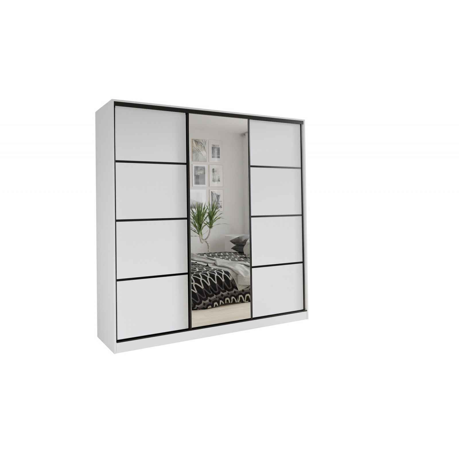 Kombinovaná šatní skříň s posuvnými dveřmi a zrcadlem.Rozměry (šxvxh): 200 x 205 x 56 cmMateriál: laminoBarva: bílý matŠatní skříň má:- 6 polic- 2 šatní tyče- 4 šuplíkyV ceně skříně není LED osvětlení!Možnost dokoupit LED osvětlení viz příslušenství produktu.Dodáváno v demontu