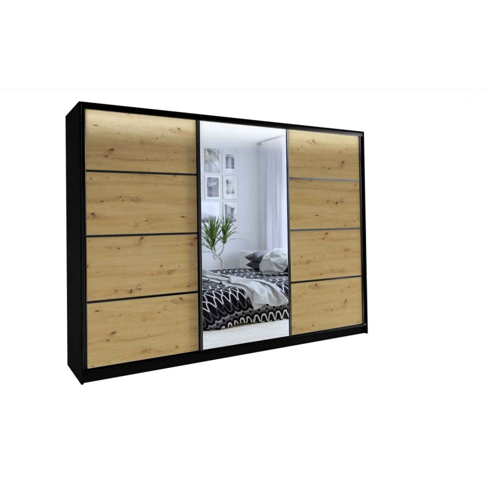Kombinovaná šatní skříň s posuvnými dveřmi a zrcadlem.Rozměry (šxvxh): 280 x 205 x 56 cmMateriál: laminoBarva: černý mat/dub artisanŠatní skříň má:- 6 polic- 2 šatní tyče- 4 šuplíkyV ceně skříně není LED osvětlení!Možnost dokoupit LED osvětlení viz příslušenství produktu.Dodáváno v demontu