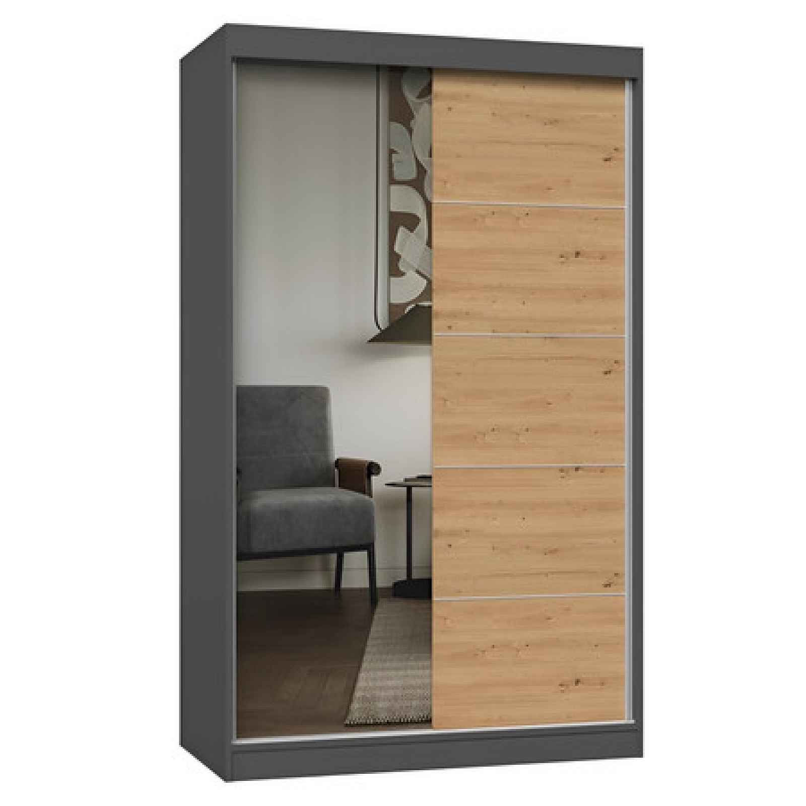 Šatní skříň Iga 120 A/C s lištami - antracit/dub artisan. Jednoduchá a kvalitní skříň, která Vás okouzlí svou jednoduchostí a elegancí. - použití kvalitních materiálů - madlo v podobě hliníkové lišty podél dveří - na jednom čele dveří je umístěné zrcadlo - šatní tyč na ramínka - zajímavé provedení - snadná montáž Údržba: Povrch nábytku utřete do čista měkkým hadříkem. Vyhněte se použití chemikálií.
