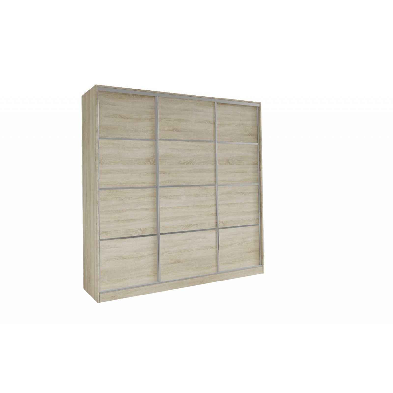 Šatní skříň s posuvnými dveřmi.Rozměry (šxvxh): 200 x 205 x 56 cmMateriál: laminoBarva: dub sonomaSkříň má:- 6 polic- 2 šatní tyče- 4 šuplíkyDodáváno v demontu