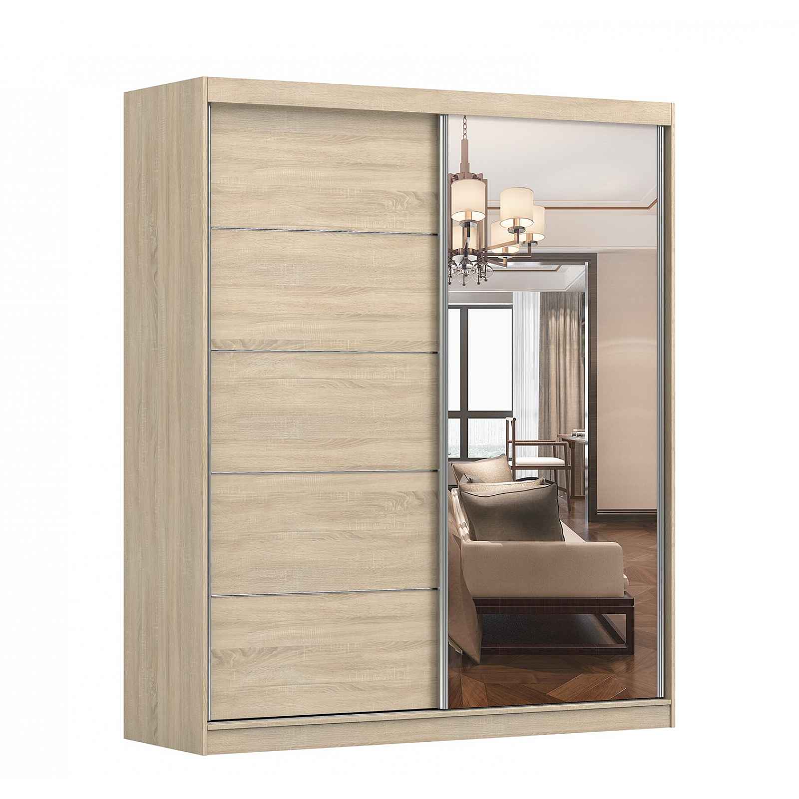 Šatní skříň s posuvnými dveřmi a zrcadlemBarva: dub sonomaRozměry (šxvxh): 183 x 218 x 61 cmMateriál: lamino tloušťky 16 mm s ABS hranamiÚchyty: hliníkovéLišty: kovovéDodáváno v demontu