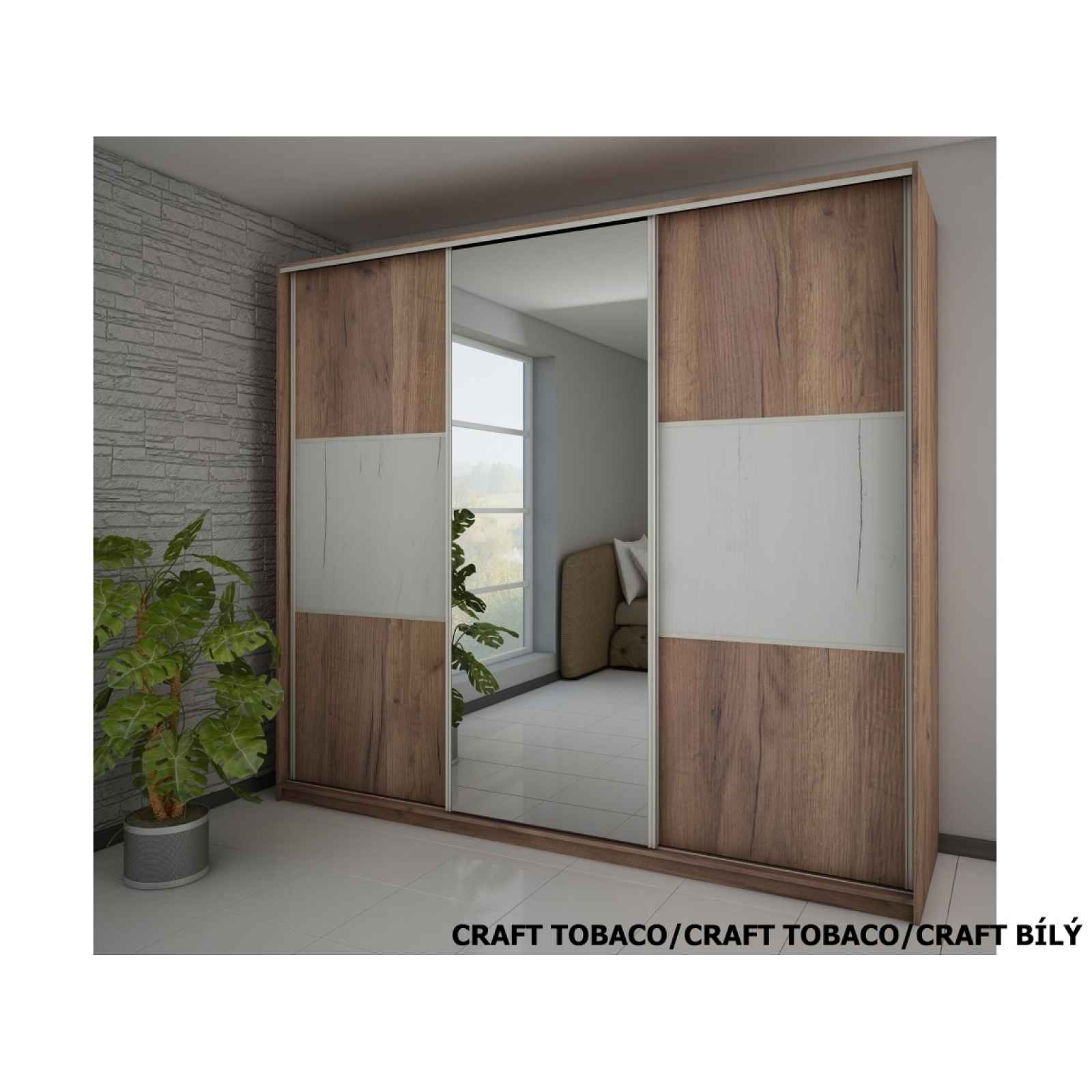 Šatní skříň se zrcadlem Vnitřní členění viz další obrázek. Rozměr (šxvxhl): 240 x 216 x 65 cm Materiál: LTD 16 mm Barva (korpus/dveře/pruh na dveřích): craft tobaco/craft tobaco/craft bílý Dodává se v demontu. Záruka 5 let.