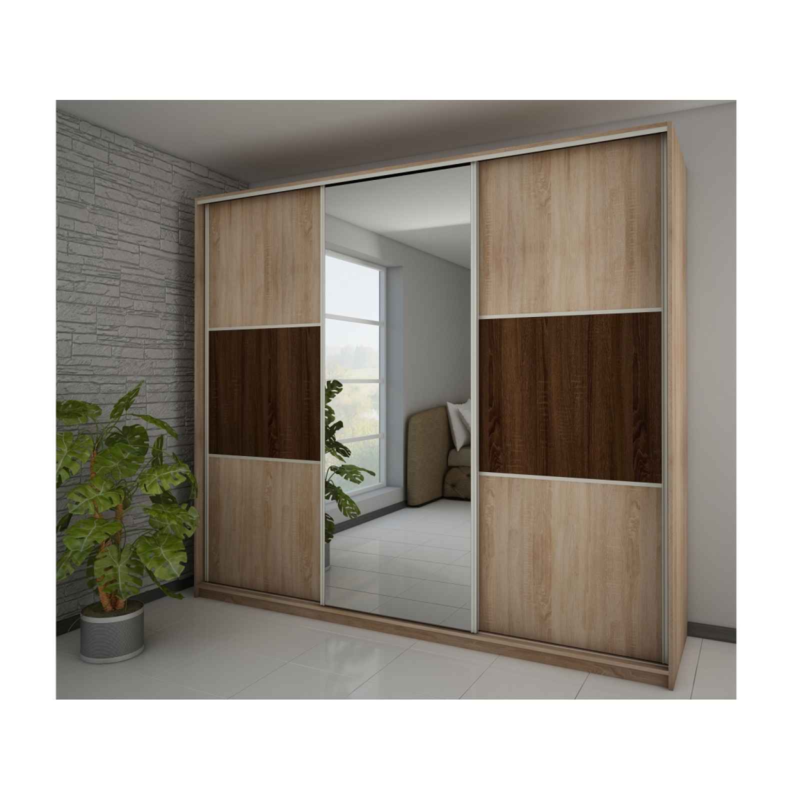 Šatní skříň se zrcadlem Vnitřní členění viz další obrázek. Rozměr (šxvxhl): 240 x 216 x 65 cm Materiál: LTD 16 mm Barva (korpus/dveře/pruh na dveřích): dub sonoma sv./dub sonoma sv./dub sonoma tm. Dodává se v demontu. Záruka 5 let.