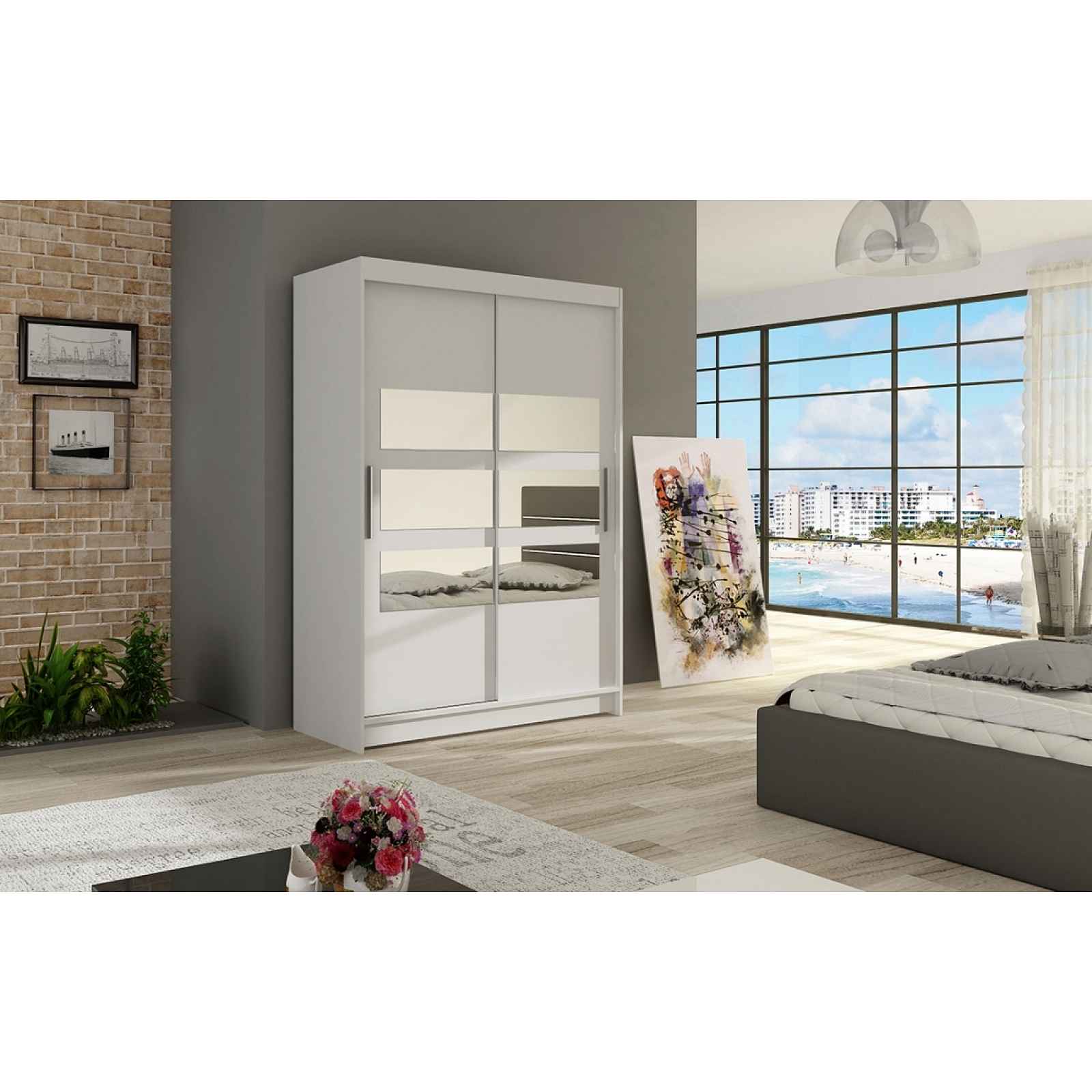 Šatní skříň se zrcadlovými pruhy Barva: bílý mat Rozměry (šxhxv): 120 x 58 x 200 cm Materiál: - laminovaná deska o tloušťce 16 mm, hrany ABS - hliníkové kolejnice Sevroll Dodání v demontu. Záruka 24 měsíců.