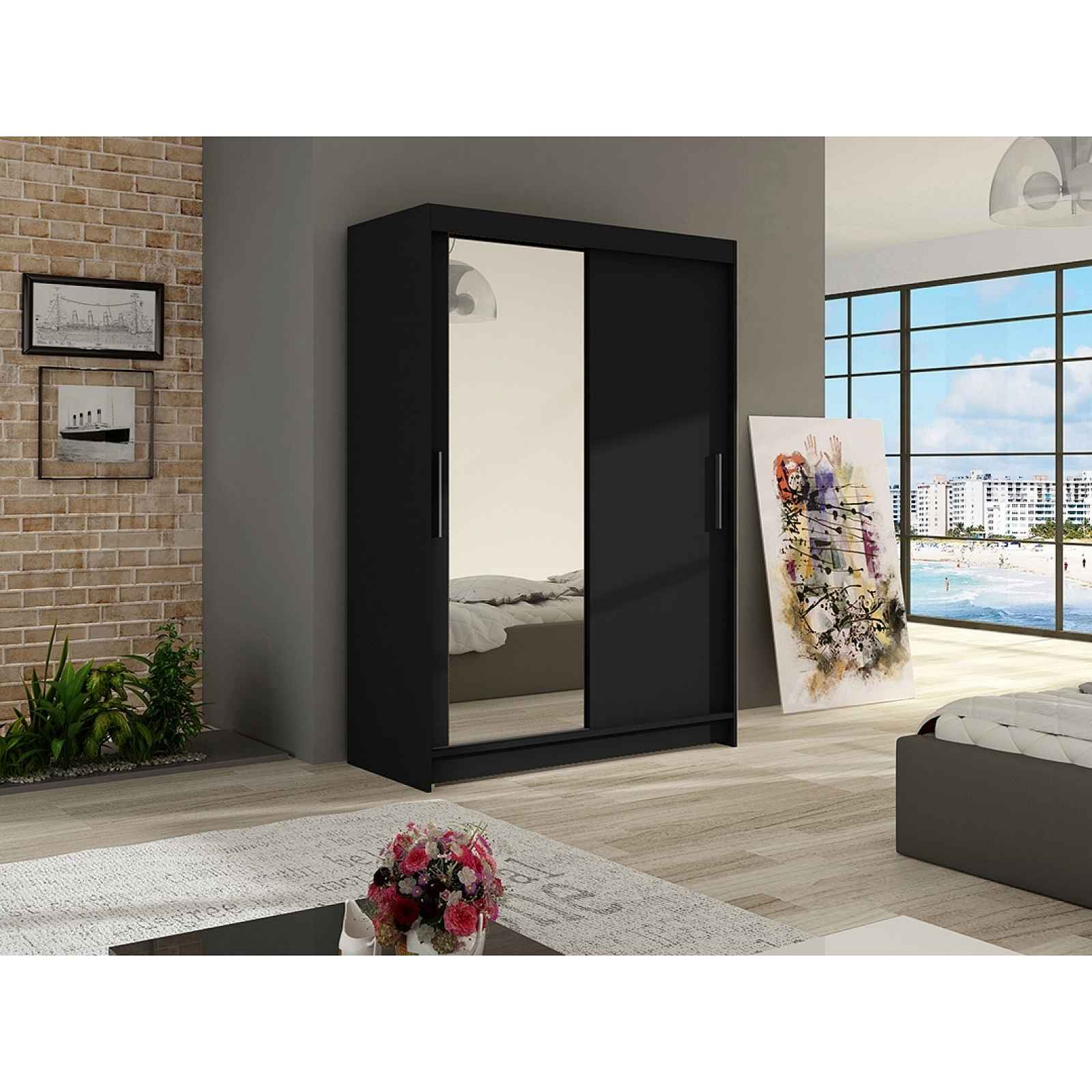 Šatní skříň s posuvnými dveřmi a se zrcadlem Barva: černý mat Rozměry (šxhxv): 120 x 58 x 200 cm Materiál: - laminovaná deska o tloušťce 16 mm, hrany ABS - hliníkové kolejnice Sevroll Dodání v demontu. Záruka 24 měsíců.