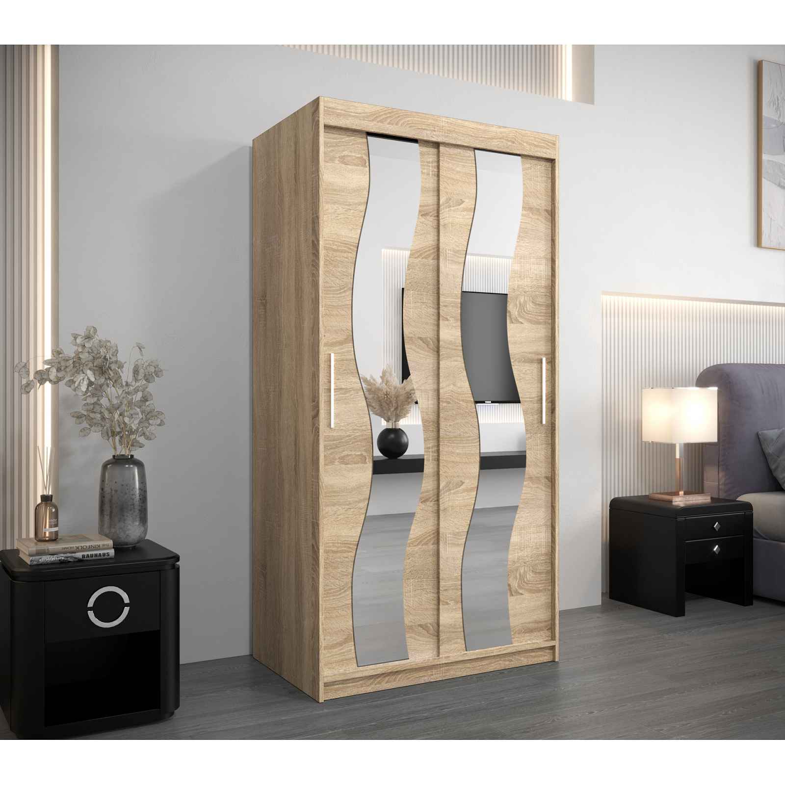 Šatní skříňPrakticky řešené vnitřní uspořádání Leštěné zrcadlo na přední straněNadčasové barvy a jednodušší linieKorpus: 16 mm silná laminovaná deskaStříbrné plastové rukojetiHliníková vodítkaKovové tyčePřední strana: 16 mm silná laminovaná deska Zadní strana skříně z HDF desky Posuvný systém BIMAK Hrany jsou zakončeny 0,5mm PVC dýhou odolnou proti poškození Parametry: (šířka x výška x hloubka) 100x200x62 cm