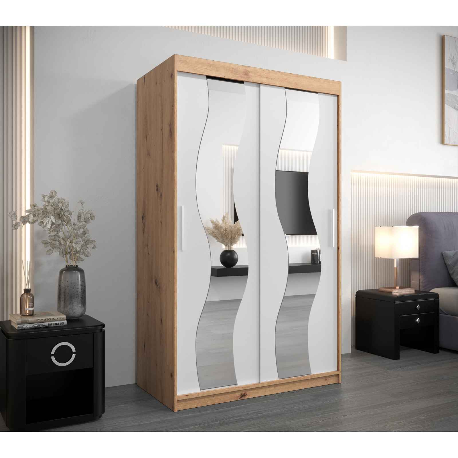 Šatní skříňPrakticky řešené vnitřní uspořádání Leštěné zrcadlo na přední straněNadčasové barvy a jednodušší linieKorpus: 16 mm silná laminovaná deskaStříbrné plastové rukojetiHliníková vodítkaKovové tyčePřední strana: 16 mm silná laminovaná deska Zadní strana skříně z HDF desky Posuvný systém BIMAK Hrany jsou zakončeny 0,5mm PVC dýhou odolnou proti poškození Parametry: (šířka x výška x hloubka) 120x200x62 cm
