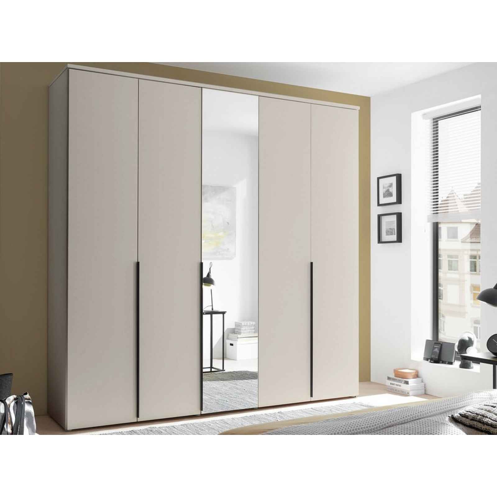 Šatní skříň se zrcadlem má celkovou šířku 225 cm a moderní styl. Skříň v béžové barvě za 5 otočnými dveřmi nabízí úložné prostory s šatními tyčemi a policemi. Šatní skříň se zrcadlem má celkovou šířku 225 cm a moderní styl se svislými úchyty. Tato skříň v barvě béžová kašmír za 5 otočnými dveřmi nabízí úložné prostory s šatními tyčemi a policemi. Skříň dobře poslouží v moderním prostoru ložnice, v šatně anebo komoře pro všestranné ukládání. Vnitřní prostory můžete navíc doplnit dalšími policemi v případě potřeby. - materiál: laminovaná dřevotříska 15 mm/22 mm, kov, plast, zrcadlové sklo - dekor korpus: béžová kašmír mat - dekor přední plochy: béžová kašmír mat - úchyt: plast, černé - moderní styl - šířka: 225 cm - 5 x otočné dveře - 1 x zrcadlo - členění vnitřního prostoru: 3 x vnitřní blok - levý vnitřní blok: šířka cca 87,5 cm, otevřený úložný prostor, 1 x kovová závěsná šatní tyč, 1 x police - středový vnitřní blok: šířka cca 43 cm, otevřený úložný prostor, 1 x kovová závěsná šatní tyč, 1 x police - pravý vnitřní blok: šířka cca 87,5 cm, otevřený úložný prostor, 1 x kovová závěsná šatní tyč, 1 x police - vyobrazení vnitřního prostoru: viz fotogalerie - dekor vnitřního prostoru: bílá mat/béžová mat - další vnitřní police: lze doobjednat samostatně jako sdružený produkt - dodáváno v demontu
