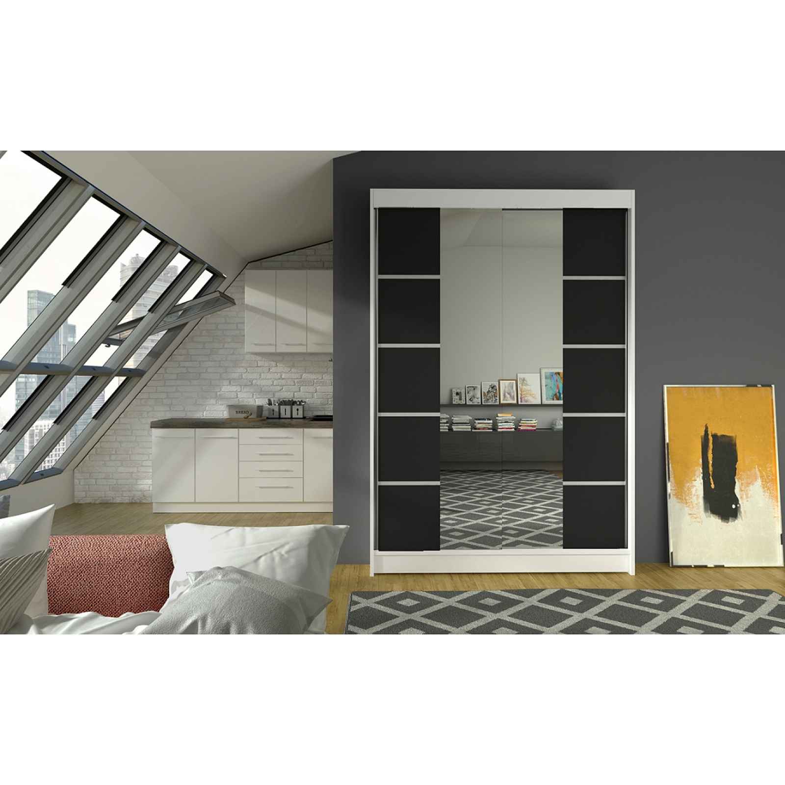 Šatní skříň se zrcadlem Barva: bílá/černá Rozměry (šxhxv): 120 x 58 x 200 cm Materiál: - laminovaná deska o tloušťce 16 mm, hrany ABS - hliníkové kolejnice Sevroll - úchyty ve formě hliníkové lišty, která zabrání ohýbání dveříDodáváno v demontu.