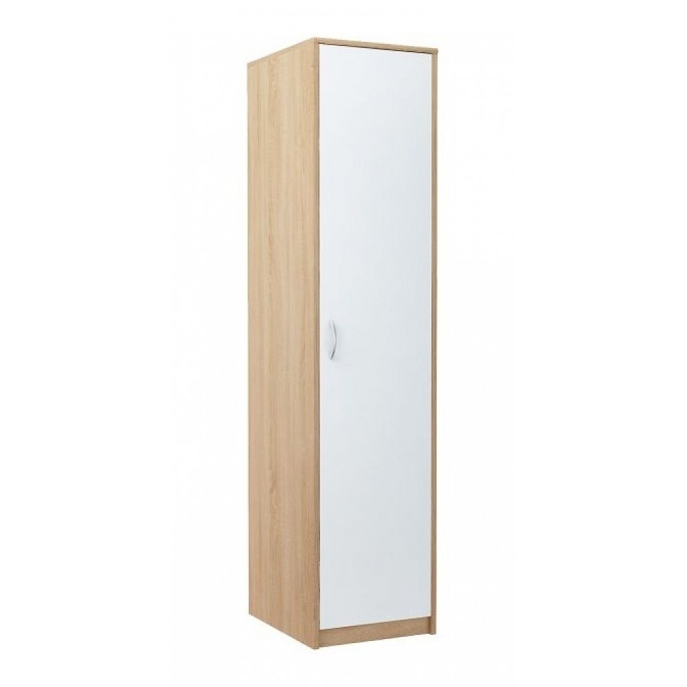 Šatní skříň, dub sonoma/bílá. Korpus i dvířka jsou z kvalitní LTD. Korpus je v barvě dub sonoma, dvířka v barvě matné bílé. Lamino je odolné vůči vysokým teplotám, poškrábání a nárazům, hraněné ABS páskou. Jasně viditelná struktura dřeva. Výška: 193 cm Šířka: 45 cm Hloubka: 55 cm Materiál: LTD (lamino) Dodáváno v demontu. Záruka 24 měsíců.