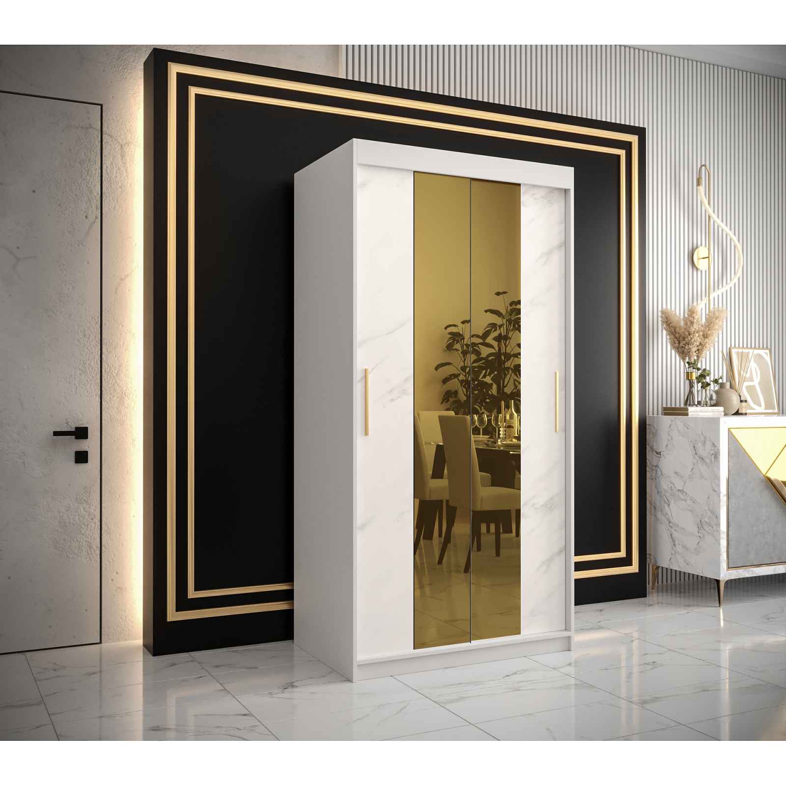 Posuvná šatní skříň Zlatana potěší každého milovníka luxusního vzhledu svým designem dveří ve vzoru mramoru a leštěným zrcadlem zlaté barvy. Prakticky řešené vnitřní uspořádání zajistí, že si budete moci oblečení rozdělit přesně tak, jak potřebujete. Vlastnosti: korpus: laminované desky o tloušťce 16 mm zakončené dýhou z PVC hrubou 0,5 mmpřední strana: laminované desky o tloušťce 16 mm zakončené dýhou z PVC hrubou 0,5 mmrukojeti: plast v zlaté barvě lišty dveří: hliníkzadní deska: HDFzrcadlo ve zlaté barvěposuvný systém od firmy BIMAK Nábytek je dodáván v demontu Parametry: (šířka x výška x hloubka) 100x200x62 cm