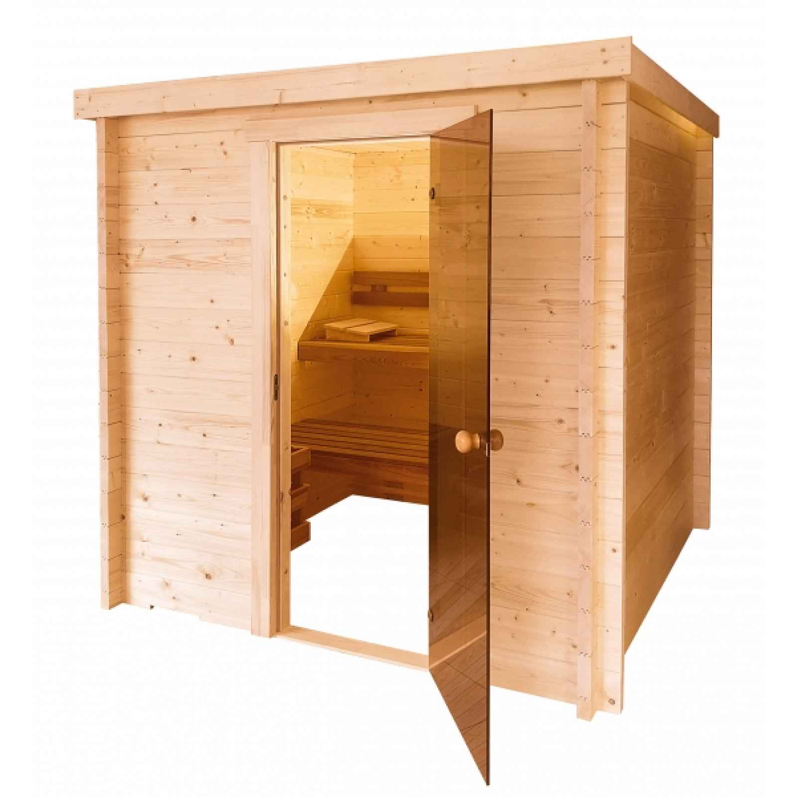 saunový korpus ze severského smrkového dřeva, do interiéru, tloušťka stěny 40 mm (masiv), panelový strop (vnitřní strana smrk 14 mm) s izolací 40 mm a liníkovou folií, tloušťka stěny 40 mm, rozměr 1560×1560×2110 mm, bez zdroje tepla