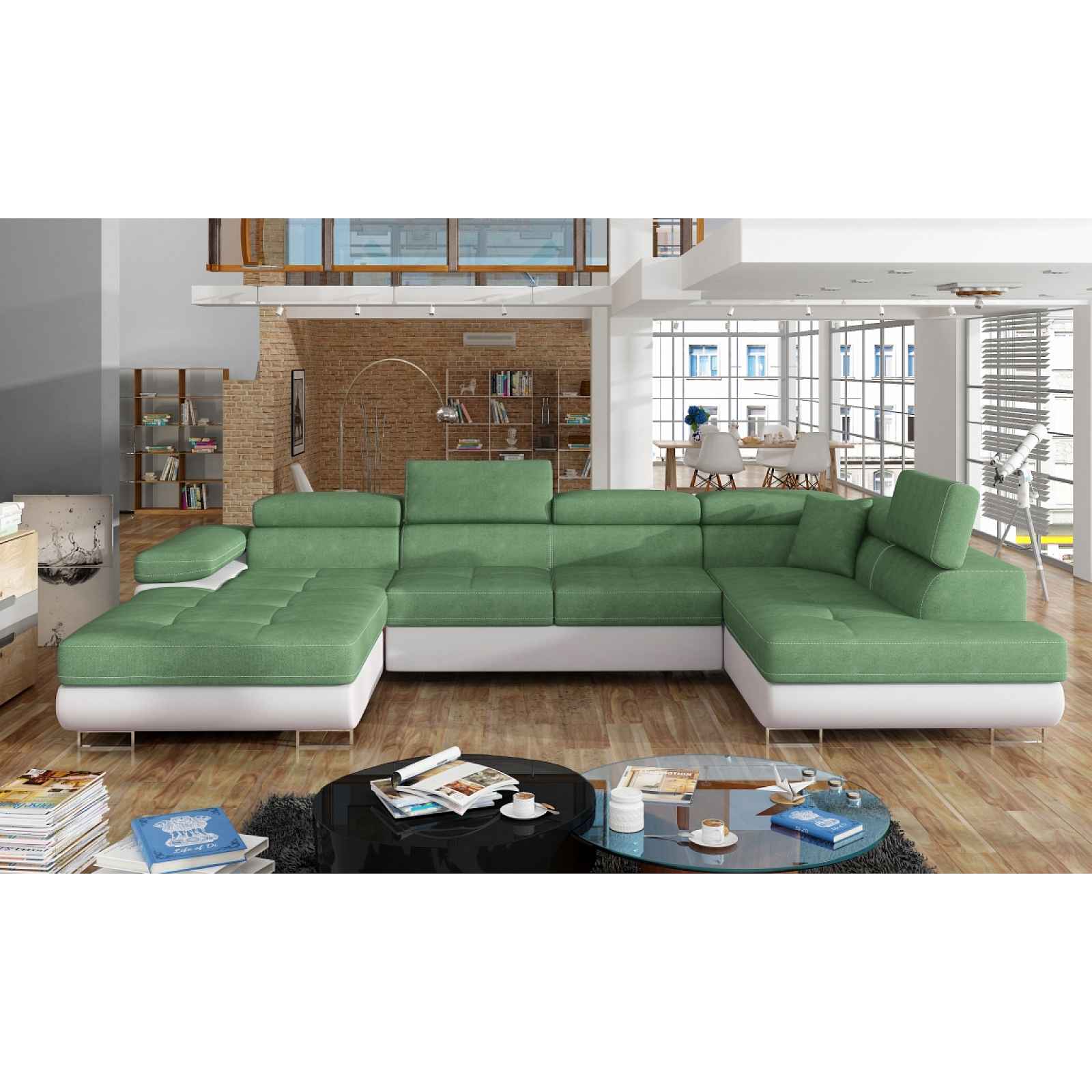 Rozkládací sedačka ve tvaru U Provedení: PRAVÉMateriál: kombinace látky a ekokůžeFotografie rozložené sedačky a její detaily jsou ilustrační, jiná barva! Potahová látka: Soro 34 = zelenáPotahová ekokůže: Soft 17 = bílá Rozměr (šxvxh): 345 x 70/90 x 202 cm -výška sedu: 43 cm-hloubka sedu: 58 cm-plocha na spaní po rozložení: 125 x 266 cmMechanismus rozkladu: delfín Dodáváno v demontu.