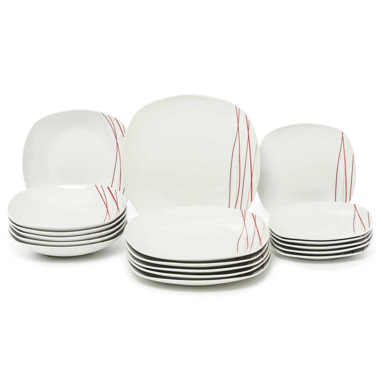 18dílná jídelní sada z kvalitního porcelánu s červenobéžovým dekorem vás jen tak neomrzí. Vzor proužků je nadčasový a trendy. Skvěle se hodí pro slavnostní tabuli i pro každodenní stolování. Obsah sady: 6x dezertní talíř: 19 x 19 cm 6x mělký talíř: 25 x 25 cm 6x hluboký talíř: 21,5 x 21,5 cm, v. 4,5 cm