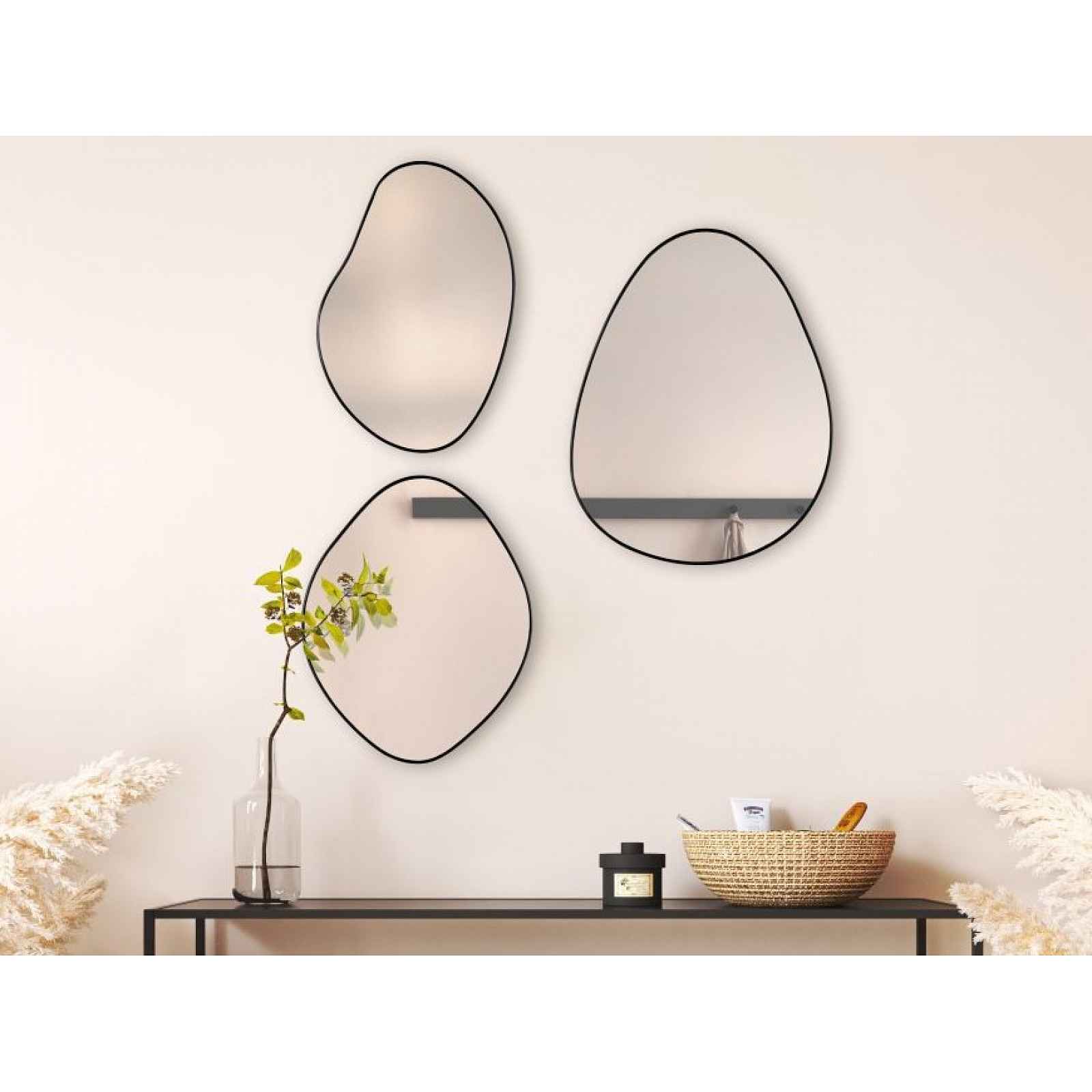 Sada nástěnných zrcadel (3 ks) v černém tenkém kovovém rámu promění prázdnou stěnu v designové dílo. Sada obsahuje 3 nástěnná dekorační zrcadla v tenkém černém hliníkovém rámu, která promění i obyčejnou stěnu v působivé designové dílo. Díky rozdílným tvarům a velikostem můžete zrcadla aranžovat na mnoho způsobů – od čistých geometrických sestav až po hravé, nepravidelné kompozice podle vaší fantazie. - obsah balení: 3 x dekorativní nástěnné zrcadlo - materiál: zrcadlové sklo, hliník - tloušťka rámu: 0,4 cm - barva rámu: černá - variabilita uspořádání: vertikální i horizontální zavěšení - snadná instalace: každé zrcadlo je vybaveno vlastním úchytem pro bezpečné zavěšení - dekorační i praktický doplněk - styl: moderní, minimalistický - rozměry: 22x28 cm, 17x25 cm, 20x25 cm
