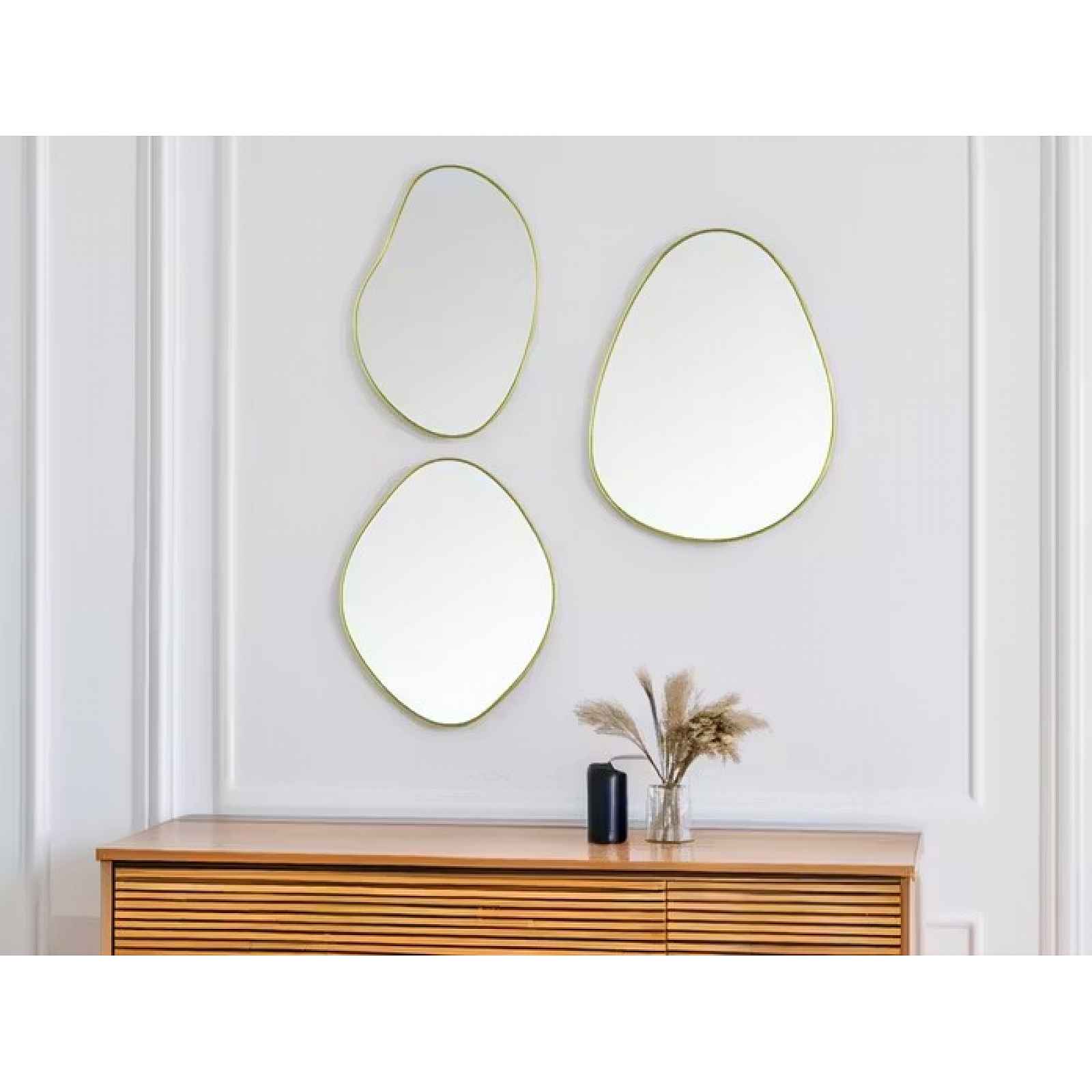 Sada nástěnných zrcadel (3 ks) ve zlatém tenkém kovovém rámu promění prázdnou stěnu v designové dílo. Sada obsahuje 3 nástěnná dekorační zrcadla v tenkém zlatém hliníkovém rámu, která promění i obyčejnou stěnu v působivé designové dílo. Díky rozdílným tvarům a velikostem můžete zrcadla aranžovat na mnoho způsobů – od čistých geometrických sestav až po hravé, nepravidelné kompozice podle vaší fantazie. - obsah balení: 3 x dekorativní nástěnné zrcadlo - materiál: zrcadlové sklo, hliník - tloušťka rámu: 0,4 cm - barva rámu: zlatá - variabilita uspořádání: vertikální i horizontální zavěšení - snadná instalace: každé zrcadlo je vybaveno vlastním úchytem pro bezpečné zavěšení - dekorační i praktický doplněk - styl: moderní, minimalistický - rozměry: 22x28 cm, 17x25 cm, 20x25 cm