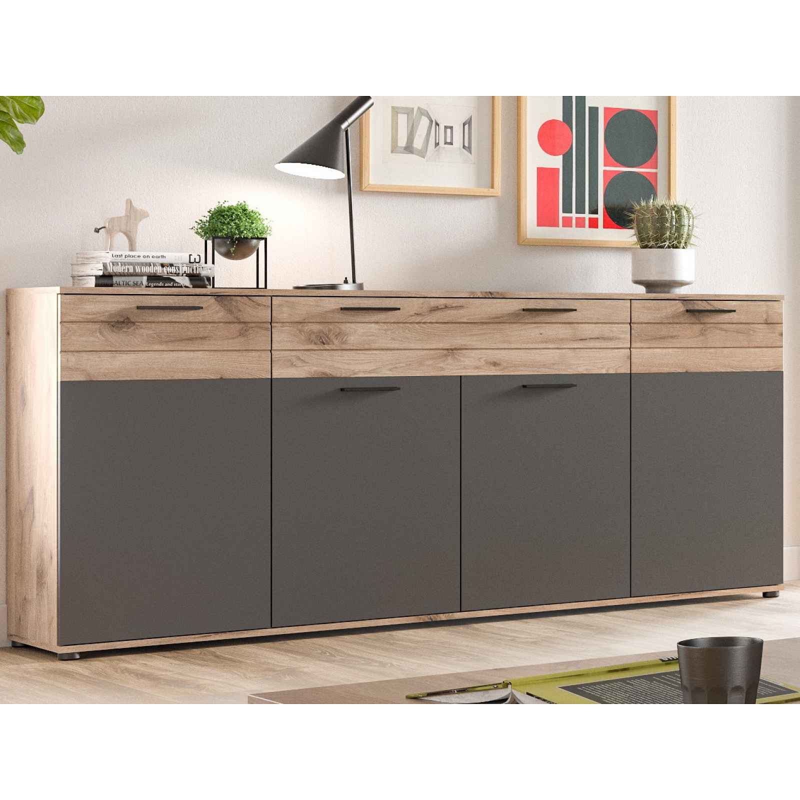 Široká komoda se zásuvkou z kolekce Mason - moderní a praktický nábytek v kombinaci dubového dřevodekoru a šedých ploch ozvláštňují horizontálně frézované linie, které dodávají nábytku zajímavý efekt. - široká komoda se zásuvkou z kolekce Mason - materiál: laminovaná dřevotříska 16 mm, MDF 16 mm, kov, plast - dekor korpus: dub nox - dekor přední plochy: dub nox/šedá mat - úchyt: plast, černá - nožky: kluzáky, plast, černá - moderní styl - horizontální frézované linie - šířka: 200 cm - 1 x zásuvka (kovové boční pojezdy) - 1 x levé dveře (úložný prostor, 2 x police) - 2 x středové dveře (úložný prostor, 1 x police) - 1 x pravé dveře (úložný prostor, 2 x police) - certifikát výrobku FSC (dřevěný materiál pocházející z ekologicky obhospodařených certifikovaných lesů) - dodáváno v demontu