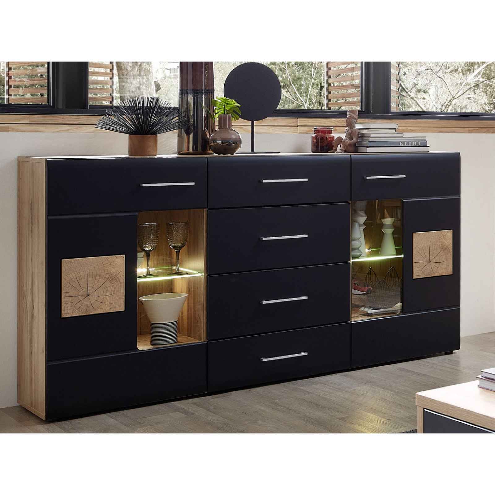 Moderní černá široká komoda s osvětlením v kombinaci s dubovým dřevodekorem pro příjemný domov inspirovaný přírodou. Stylové aplikace s optikou rozpraskaného dřeva vytváří skvělý kontrast a zaujmou na pohled. - materiál: dřevotříska 16 mm, MDF 18 mm, kov, plast, čiré sklo - dekor korpus: divoký dub wotan - dekor přední plochy: černý mat/dub s rozpraskanou optikou - úchyt: kovový profil, šedá alu - nožky: plast, černé - mechanismus Soft Close: tlumené dovírání dveří/zásuvek - zaoblené hrany předních ploch - dekorační profilace předních ploch - stylové aplikace s optikou rozpraskaného dřeva vytváří skvělý kontrast a zaujmou na pohled - moderní nábytek inspirovaný přírodními prvky - šířka: 170 cm - 1 x levé dveře (úložný prostor/vitráž, 2 x dřevěná police, 1 x skleněná police - včetně 1 x LED světlo) - 4 x zásuvka (kovové boční pojezdy) - 1 x pravé dveře (úložný prostor/vitráž, 2 x dřevěná police, 1 x skleněná police - včetně 1 x LED světlo) - včetně LED osvětlení (sada 2 ks LED světel, barva světla teplá bílá, včetně trafa, vypínače i přívodových kabelů, třída energ. účinnosti A-A++) - kvalitní zpracování - dodáváno v demontu