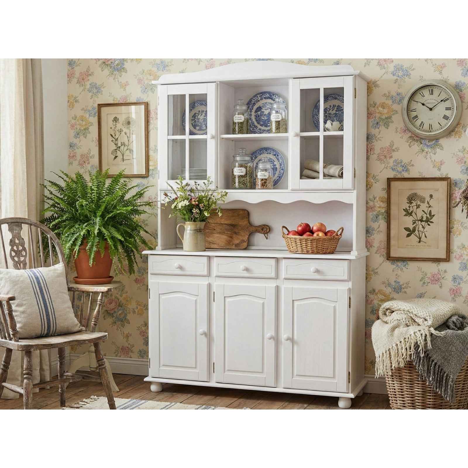 Široká vitrína v oblíbeném venkovském stylu je vyrobena z běleného borovicového dřeva. Dekorativní prolisy dveří, tvarované úchyty a masivní nohy dokonale dotváří útulnou atmosféru domova.