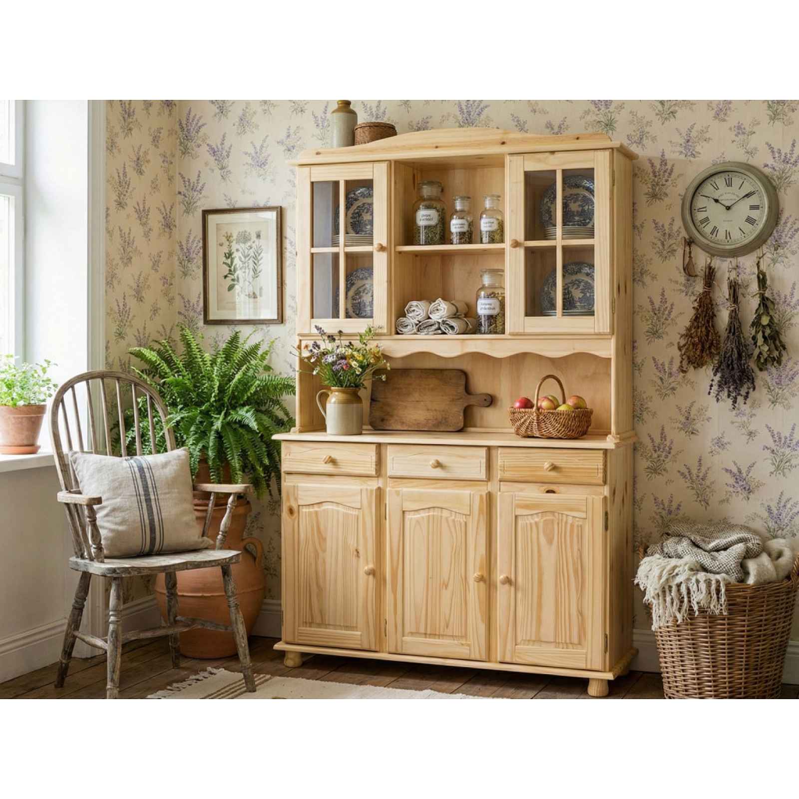 Široká vitrína v oblíbeném venkovském stylu je vyrobena z přirozeného borovicového dřeva. Dekorativní prolisy dveří, tvarované úchyty a masivní nohy dokonale dotváří útulnou atmosféru domova. - materiál: masivní borovicové dřevo, sololit, kov, čiré sklo - povrchová úprava: čirý bezbarvý lak - úchyty: stylově tvarované - nohy: dřevěné (přední nohy dekorativně tvarované) - dekorativní frézované prolisy předních ploch - 3 x dolní dveře (uvnitř úložný prostor, vnitřní police) - 3 x zásuvka (kovové boční pojezdy) - 1 x otevřený odkládací prostor uprostřed (dekorativní zaoblená římsa, hloubka odkládacího prostoru cca 28 cm, výška prostoru po horní římsu cca 28 cm, výška vnitřního prostoru přihrádky cca 35 cm) - 1 x levé horní dveře - prosklené (uvnitř úložný prostor, 1 x vnitřní police) - 2 x horní otevřená přihrádka - 1 x pravé horní dveře - prosklené (uvnitř úložný prostor, 1 x vnitřní police) - do vitríny můžete uložit jídelní servis, dekorace nebo knihy - oblíbený venkovský styl - dokonale dotváří útulnou atmosféru domova - stabilní konstrukce - dodáváno v demontu