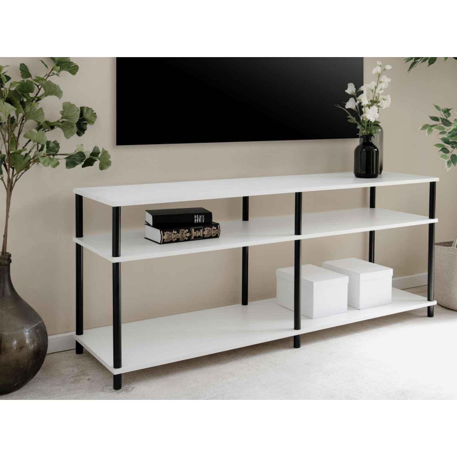 Široký regál v bílé barvě má šířku 140 cm a lze ho univerzálně využít i jako TV stolek. Černá kovová konstrukce zajišťuje stabilitu. Široký regál v bílé barvě má šířku 140 cm a lze ho univerzálně využít i jako TV stolek. Regál má 2 široké přihrádky pro ukládání jakýchkoliv věcí a černá kovová konstrukce zajišťuje stabilitu. - materiál: kov, MDF 15 mm - podnož/konstrukce: kov, kulatý profil, průměr 25 mm - povrchová úprava: černý lak - šířka: 140 cm - výška: 60 cm - 3 x police - dekor police: bílá mat - 2 x široká otevřená přihrádka (prostor v dolní přihrádce 140x34x40 cm, prostor v horní přihrádce 140x15x30 cm) - univerzální využití jako regál nebo televizní stolek - na knížky, časopisy, šanony, dekorace, kytky, hračky, umístění TV, lampičky atd. - doporučené ukotvení ke stěně - dodáváno v demontu