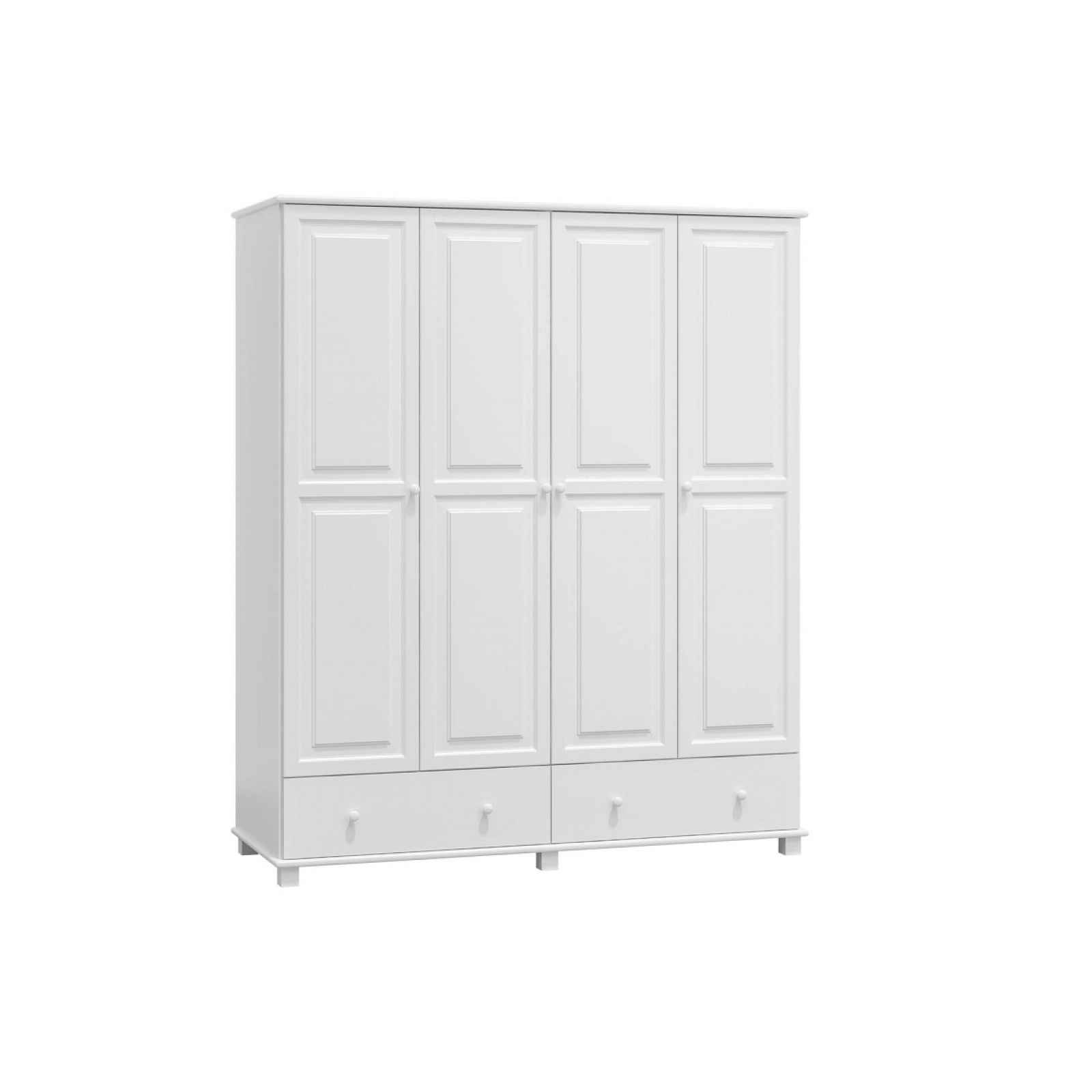 Čtyřdveřová šatní skříň Materiál: masiv borovice, tloušťka 2,6 cm Barva moření: bílá Rozměry (výška x šířka x hloubka): 190 x 160 x 60 cm Dodáváno v demontu.