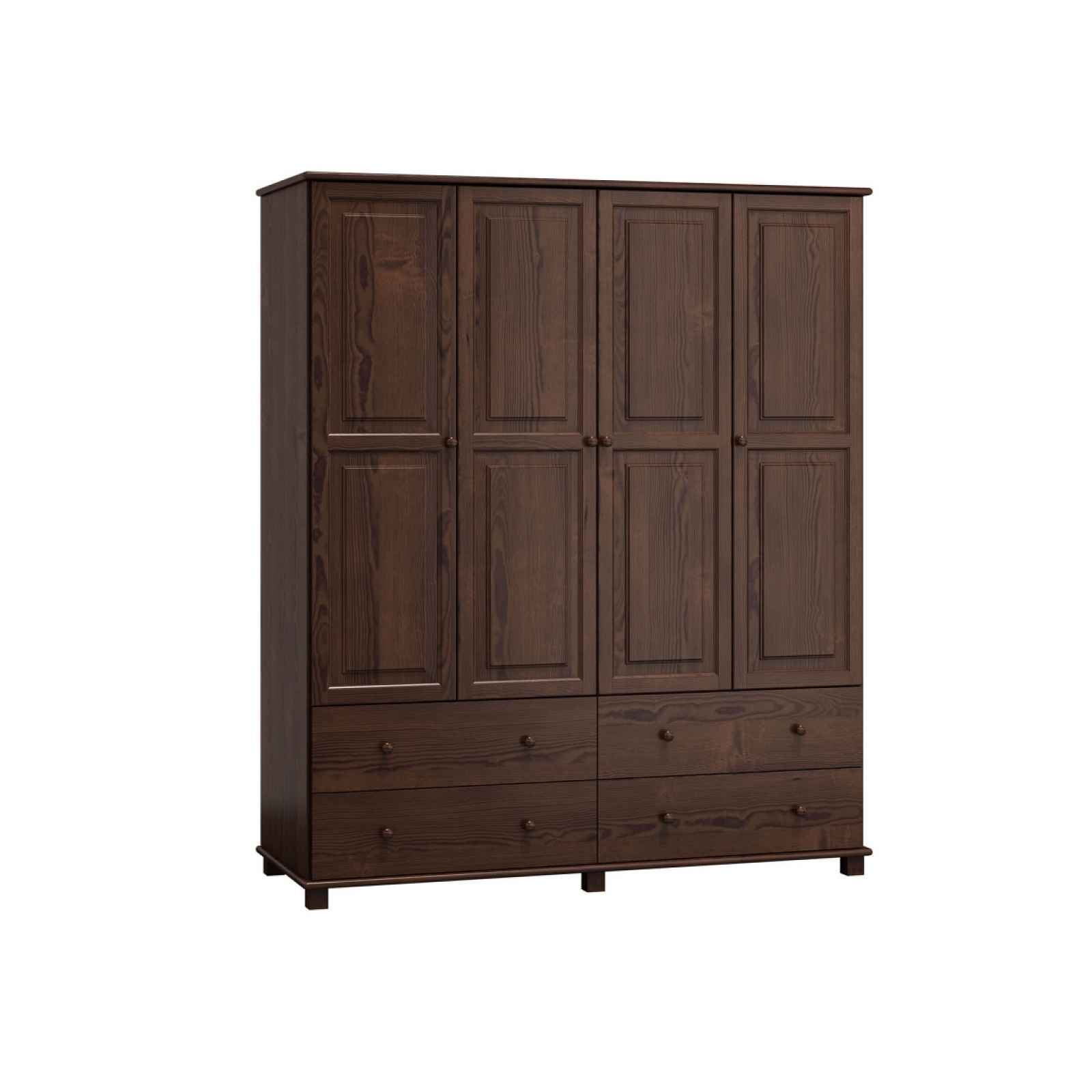 Čtyřdveřová šatní skříň Materiál: masiv borovice, tloušťka 2,6 cm Barva moření: ořech Rozměry (výška x šířka x hloubka): 190 x 160 x 60 cm Dodáváno v demontu.