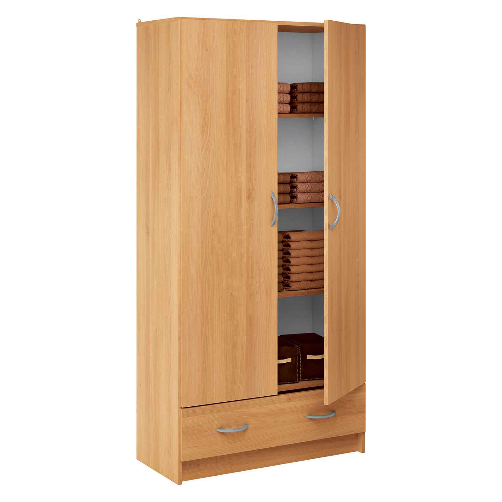 Svěží a elegantní šatní skříň s policemi. S přehledem do ní uschováte mnoho vašeho oblečení či doplňků. Využít ji můžete v ložnici, předsíni i šatně. Barva: buk Rozměr (šxvxh): 82 x 168 x 38 cm Materiál: lamino Součástí skříně je 1 široká zásuvka s kovovými pojezdy a 3 police, které lze variabilně využít. Dodáváno v demontu. Záruka 24 měsíců.