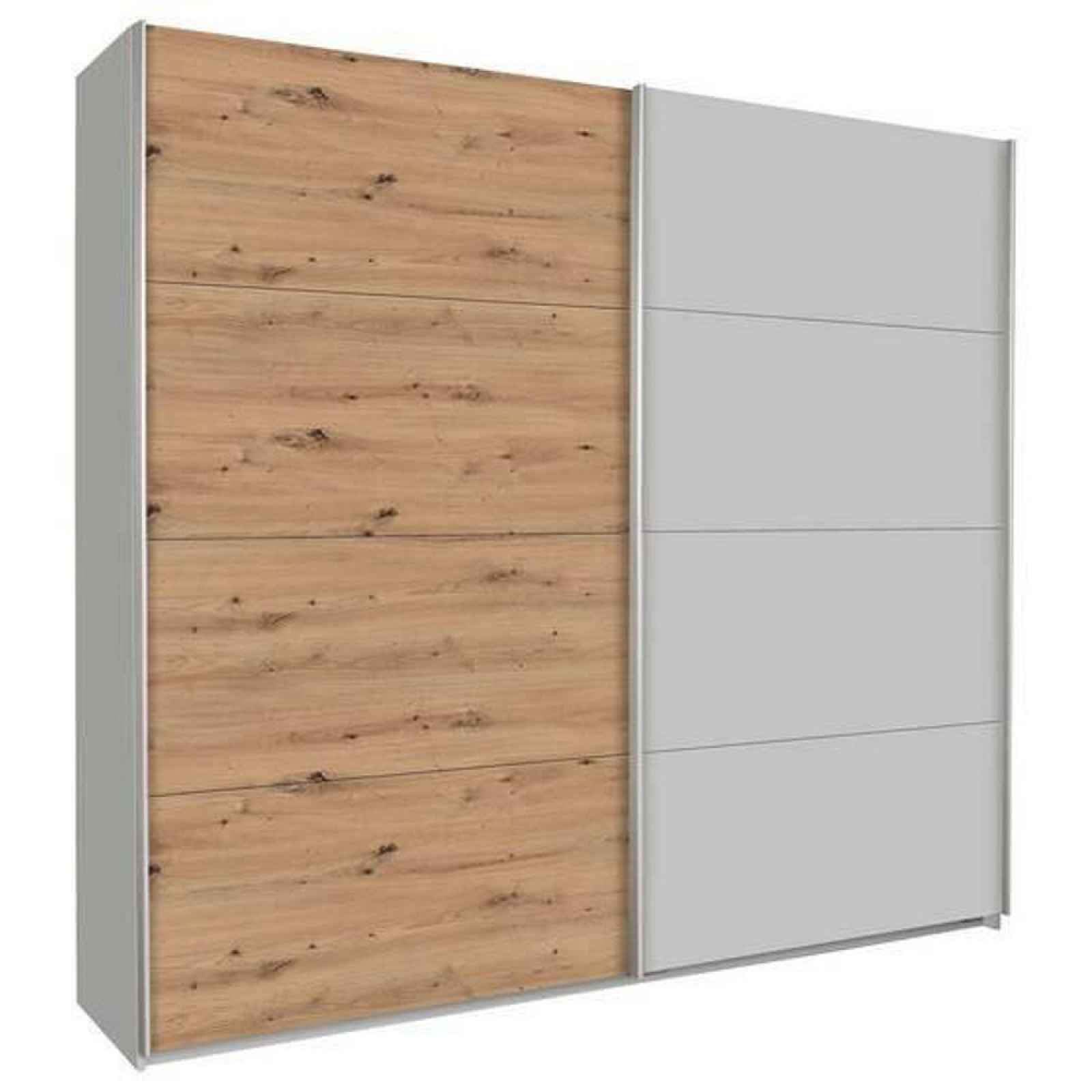Šatní skříň v dekoru dub Artisan / šedá s 2 posuvnými dveřmi. Vnitřní vybavení tvoří 2 vkládací police a 2 šatní tyče. Skříň má hůlkovou úchytku v barvě hliníku. Š / V / H: 226/210/62 cm.
