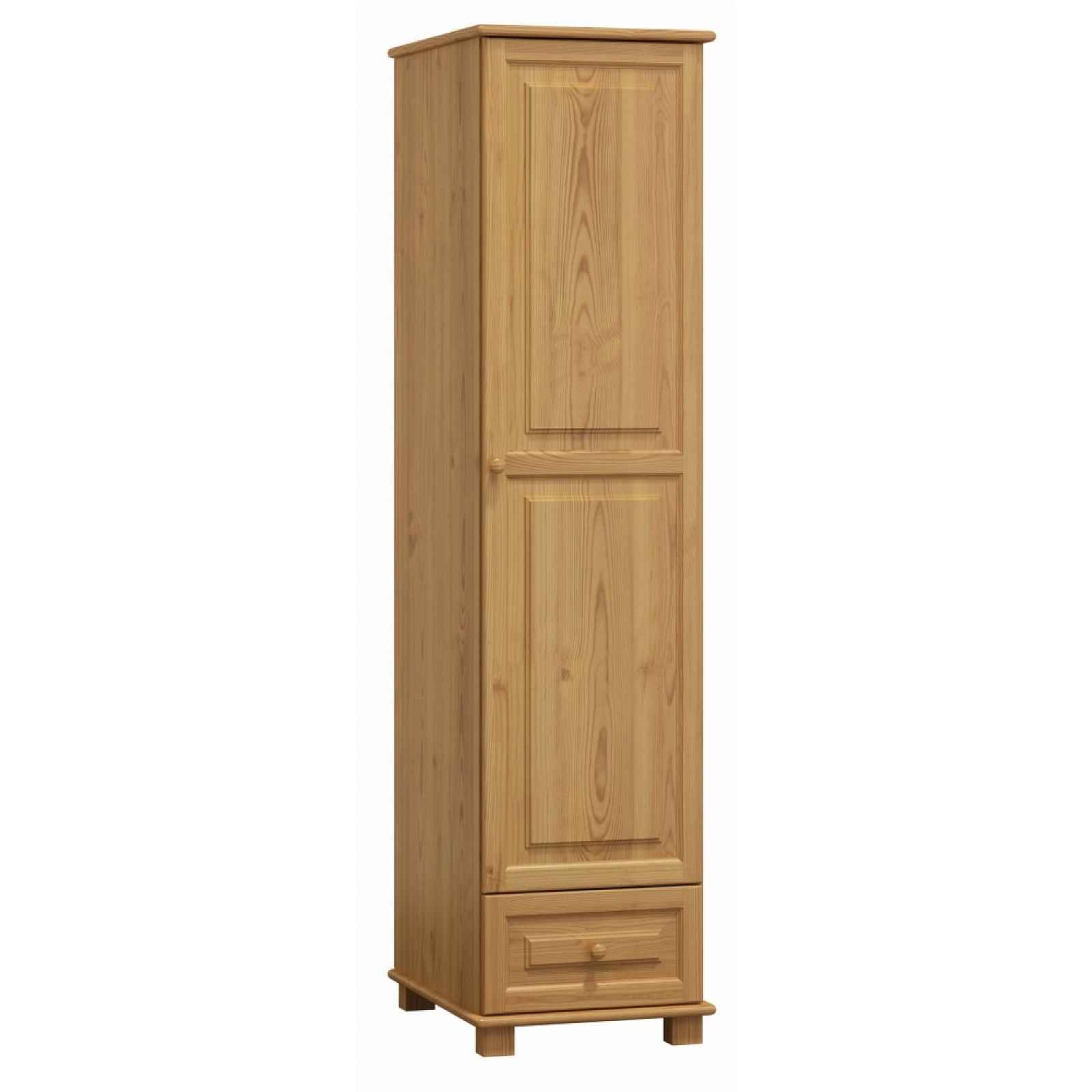 Skříň se zásuvkou a šatní tyčí Materiál: masiv borovice, tloušťka 2,6 cm Barva moření: olše Rozměry (výška x šířka x hloubka): 190 x 47 x 60 cm Dodáváno v demontu.