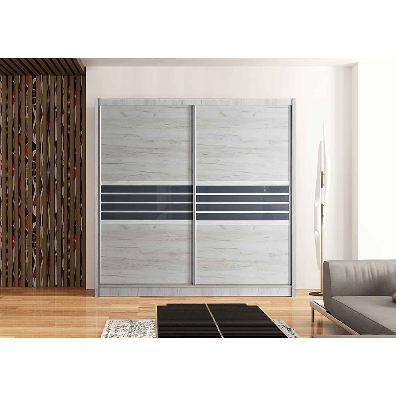 Skříň 203 cm s posuvnými dveřmi Barva: dub craft/grafitové sklo Rozměry (šxvxh): 203 x 215 x 61 cm Materiál: LTD (lamino), úchyty - plast Osvětlení v ceně skříně. Dodání v demontu. Záruka 24 měsíců.