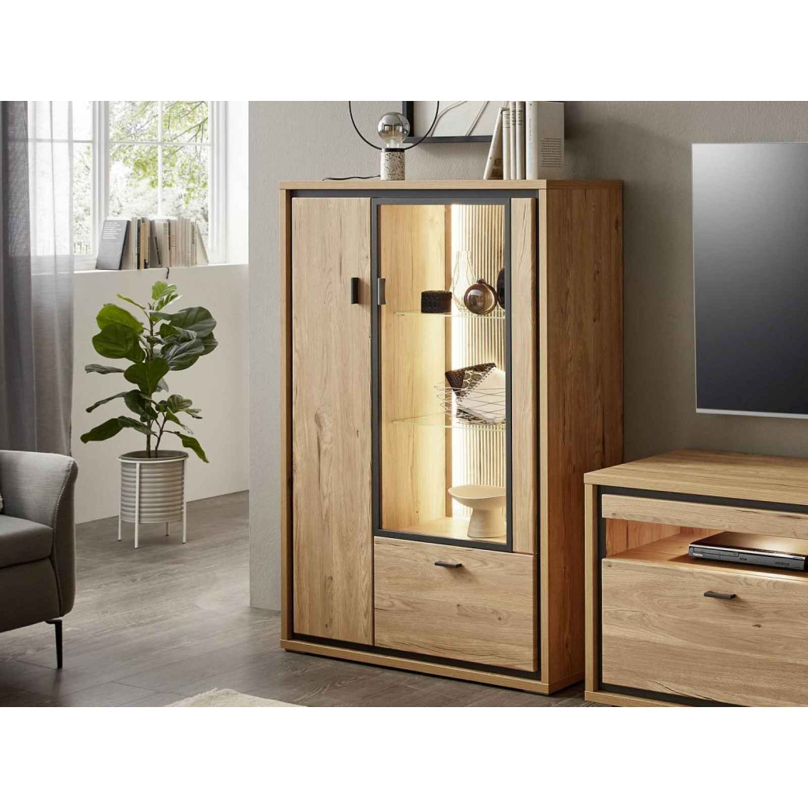 Skříňka s prosklením z programu Flores - elegantní design nábytku je doplněn kontrastním orámováním předních ploch, které zvýrazňuje tóny dubového dřevodekoru. Skříňka s prosklením z programu Flores - elegantní design nábytku je doplněn kontrastním orámováním předních ploch v antracitovém provedení, které zvýrazňuje přirozené tóny útulného dubového dřevodekoru. Tento moderní nábytek tak vdechne do bytu pocit útulného prostředí, kde se budete cítit příjemně. Navíc oceníte kvalitní zpracování i snadnou údržbu, což přidává na hodnotě. Tento nábytek bude skvěle pasovat do moderního i klasicky zařízeného interieru. - skříňka s prosklením z programu Flores - materiál: laminovaná dřevotříska 16 mm/22 mm, MDF 19 mm, kov, plast, čiré bezpečnostní sklo - dekor: dub gustavson/šedý antracit mat - úchyt: kovový profil, šedý antracit - nožky: kluzáky, plast - kvalitní závěsy dveří (nastavitelné výškově a prostorově) - mechanismus Soft Close: tlumené dovírání dveří a zásuvek - zesílená konstrukce rámu = mohutnější vzhled - moderní elegantní design - kontrastní orámování předních ploch - prosklení předních ploch - viditelné vnitřní zádové stěny: speciální folie v strukturované 3D optice (po nasvícení zajímavý efekt) - šířka: 94,5 cm - 1 x levé dveře (úložný prostor, 3 x police) - 1 x zásuvka (kovové boční pojezdy) - 1 x pravé dveře - prosklené (vitráž, 2 x skleněná police) - bez osvětlení - kvalitní zpracování - model vyšší třídy - i pro náročné - vyrobeno na Slovensku - dodáváno v demontu