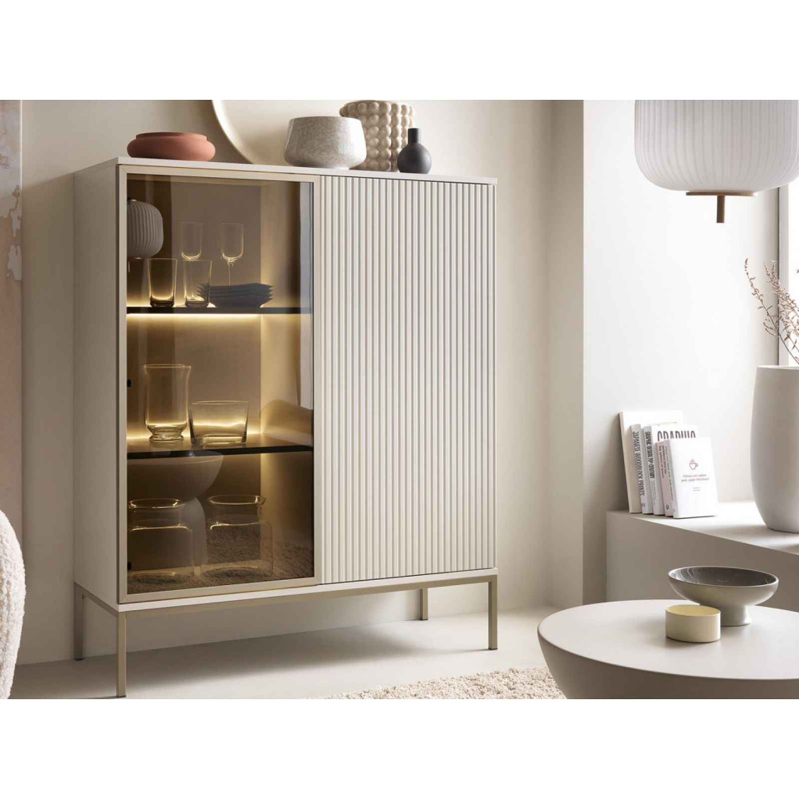 Skříňka s vitrínou Sento kombinuje moderní kašmír povrchy s kovovým rámem a podnoží v odstínu šampaň. Lamely a prosklený prostor s osvětlením přináší útulnost. Skříňka s vitrínou z kolekce Sento – stylový nábytek pro ty, kteří chtějí mít interier zařízený moderně, prakticky a zároveň útulně. Jemné kašmírově béžové povrchy doplňuje profilace, která vytváří na předních plochách zajímavý lamelový efekt. Rám prosklení z kovu v elegantním odstínu šampaň dokonale ladí s kovovou podnoží ve stejném tónu. Díky zvýšené podnoži tak může být pro vás údržba podlahy snazší. Vnitřní prosklený prostor s osvětlením doplňuje příjemnou večerní atmosféru. - skříňka s vitrínou z kolekce Sento - materiál: laminovaná dřevotříska 16 mm (ABS hrany 0,5 mm), MDF (ABS hrany 0,5 mm), kov, plast, tvrzené kouřové sklo antisol 4 mm - dekor: kašmírová béžová mat - profilované přední povrchy s lamelovým efektem - prosklení: tvrzené kouřové sklo, rám z kovu v odstínu šampaň - úchyt: bezúchytové otevírání Push to open - nožky: kovová podnož v odstínu šampaň, hranatý profil 18×18 mm, výška 20 cm (možné využít robotický vysavač) - včetně LED osvětlení (2 x světelná LED lišta, barva světla – teplá bílá, včetně trafa a přívodového kabelu, nášlapný vypínač) - moderní a zároveň útulný styl - šířka: 104 cm - 1 x levé dveře – prosklené (vitráž, 2 x police, 2 x světelná LED lišta) - 1 x pravé dveře (úložný prostor, 2 x police) - univerzální montáž dveří na pravou/levou stranu - stabilní - vyrobeno v EU - doporučené ukotvení ke stěně - dodáváno v demontu