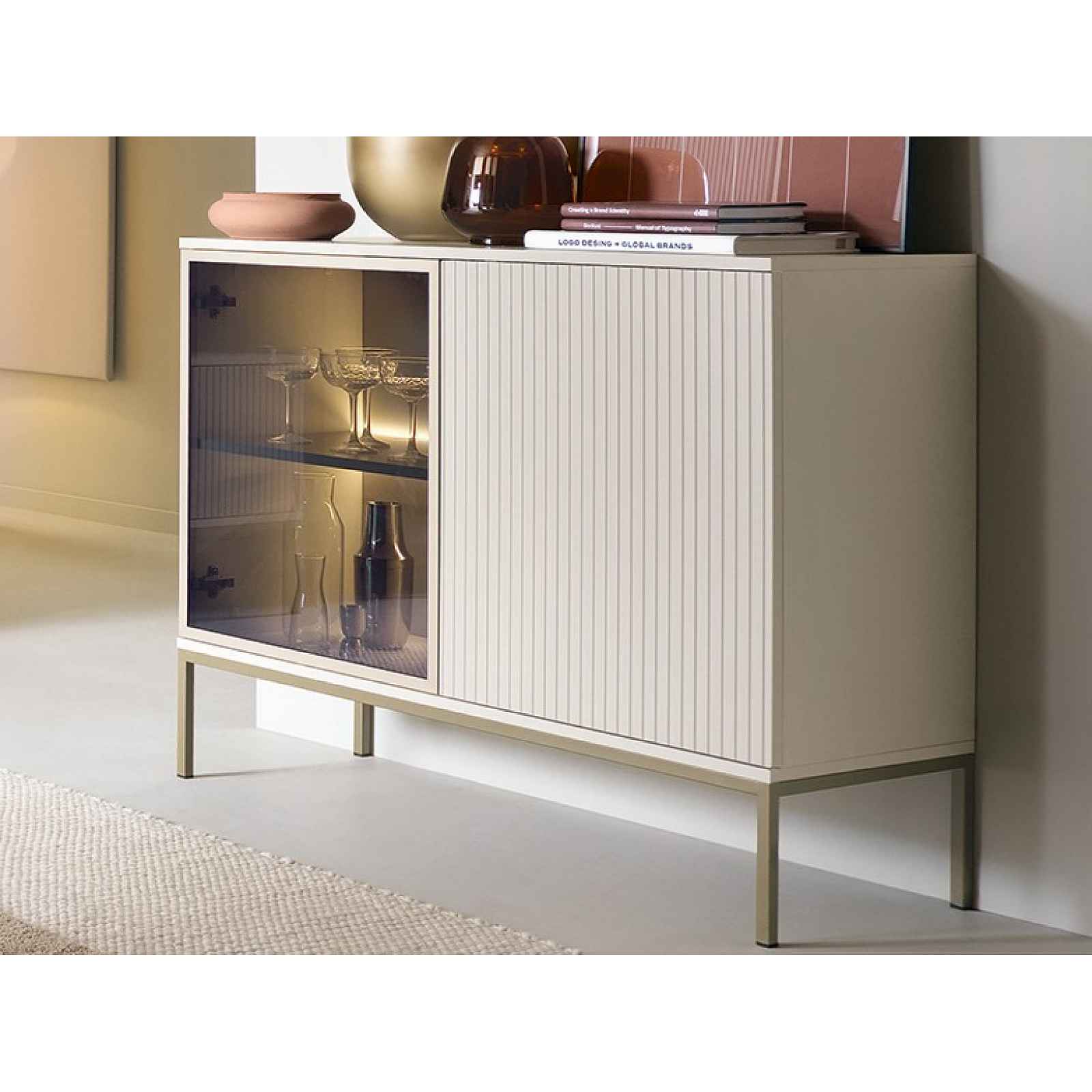 Skříňka Sento kombinuje moderní kašmírové povrchy s kovovým rámem a podnoží v odstínu šampaň. Lamely a prosklený prostor s osvětlením přinášejí útulnost. Skříňka z kolekce Sento – stylový nábytek pro ty, kteří chtějí mít interier zařízený moderně, prakticky a zároveň útulně. Jemné kašmírově béžové povrchy doplňuje profilace, která vytváří na předních plochách zajímavý lamelový efekt. Rám prosklení z kovu v elegantním odstínu šampaň dokonale ladí s kovovou podnoží ve stejném tónu. Díky zvýšené podnoži tak může být pro vás údržba podlahy snazší. Vnitřní prosklený prostor s osvětlením doplňuje příjemnou večerní atmosféru. - skříňka z kolekce Sento - materiál: laminovaná dřevotříska 16 mm (ABS hrany 0,5 mm), MDF (ABS hrany 0,5 mm), kov, plast, tvrzené kouřové sklo antisol 4 mm - dekor: kašmírová béžová mat - profilované přední povrchy s lamelovým efektem - prosklení: tvrzené kouřové sklo, rám z kovu v odstínu šampaň - úchyt: bezúchytové otevírání Push to open - nožky: kovová podnož v odstínu šampaň, hranatý profil 18×18 mm, výška 20 cm (možné využít robotický vysavač) - včetně LED osvětlení (1 x světelná LED lišta, barva světla – teplá bílá, včetně trafa a přívodového kabelu, nášlapný vypínač) - moderní a zároveň útulný styl - šířka: 104 cm - 1 x levé dveře (úložný prostor, 1 x police) - 1 x pravé dveře – prosklené (vitráž, 1 x police, 1 x světelná LED lišta) - univerzální montáž dveří na pravou/levou stranu - stabilní - vyrobeno v EU - doporučené ukotvení ke stěně - dodáváno v demontu