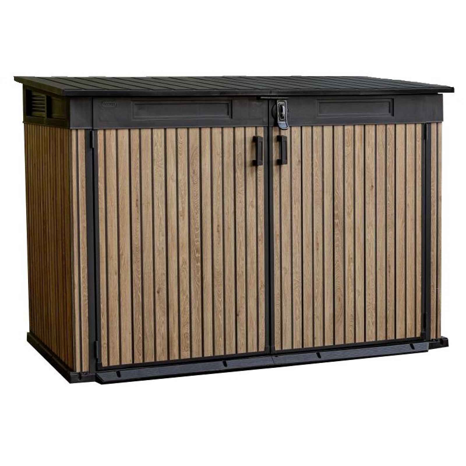 Skříň nabízí elegantní a praktické řešení pro uložení popelnic, ale i dalšího zahradního náčiní. Díky objemu 2 020 l v ní lze uschovat až dvě popelnice o objemu 360 l nebo tři popelnice o objemu 240 l. Unikátní DECOCOAT technologie: Tato inovativní technologie zajišťuje nejen dlouhodobou odolnost vůči povětrnostním vlivům, ale také nadčasový vzhled, který odpovídá trendům v moderním zahradním designu. Díky materiálu DECOCOAT má skříň velmi pevné plastové stěny. Bezúdržbovost: Materiál nekoroduje, neloupe se a není potřeba ho nijak udržovat, takže si zachová svůj vzhled i kvalitu po mnoho sezón. Jednoduchá montáž: Montáž zvládnete snadno sami, bez nutnosti profesionální pomoci. Snadné otevírání a manipulace: Hydraulické písty a kovové nerezové panty s otevíráním až do 180° usnadňují přístup, zatímco zkosený práh umožňuje snadnou manipulaci s těžšími nádobami. Přizpůsobitelné úložné možnosti: Nastavitelné držáky na police umožňují variabilní využití prostoru. Bezpečnost a ochrana: Zamykatelné dveře chrání uložený obsah. Zámek není součastí balení. Vestavěný ventilační systém zabraňuje hromadění nepříjemných pachů. Jednotný design: Skříň v elegantním odstínu hnědé barvy v imitaci uzkých lamel dřeva je součástí řady SIGNATURE. Skříň můžete doplnit dalšími výrobky z této řady, jako je zahradní domek či vysoká skříň, pro dokonalý vzhled celé zahrady. Tato skříň je ideálním řešením pro každého, kdo hledá stylovou a funkční skříň pro venkovní prostory, která dlouhodobě odolá veškerým povětrnostním podmínkám. Technické údaje: šířka výrobku: 190 cm hloubka výrobku: 109 cm výška výrobku: 132 cm hmotnost celkem: 62 kg objem: 2 020 l materiál: lisovaný plast - DECOCOAT barva: hnědá rozměr balení: 112 x 132 x 28 cm materiál balení: karton Obsah balení: 1x skříňka