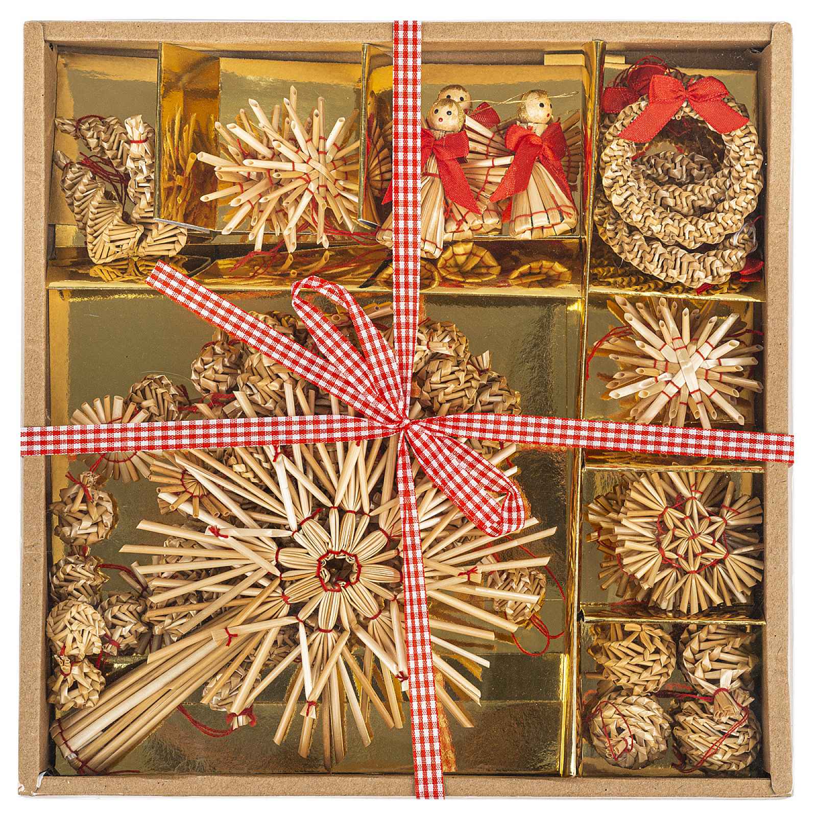 Jste příznivci tradičních slaměných ozdob? Pak se vám bude zamlouvat tato sada, kde kromě klasických ozdobiček naleznete i špičku a řetěz na váš vánoční stromek. Skvěle budou vypadat i na chvojových větvích ve váze.