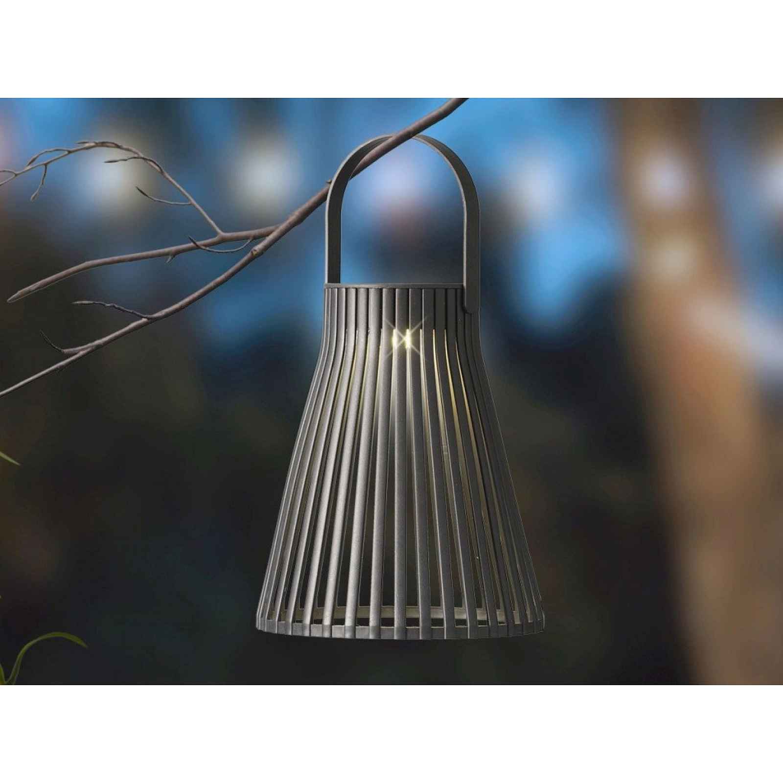 Elegantní černá závěsná solární lucerna stylově ozdobí zahradu, terasu i balkon. Přes den se nabíjí sluncem, večer svítí teplým, jemným světlem. Elegantní závěsná solární lucerna v černé barvě je ideální dekorací pro venkovní prostory, jako jsou zahrada, terasa nebo balkon. Solární lampa kombinuje moderní design s praktickou funkcí a vytváří příjemnou atmosféru díky teplému LED osvětlení. Přes den se automaticky dobíjí pomocí sluneční energie, zatímco po setmění poskytuje jemné světlo ideální pro večerní relaxaci venku. - materiál: plast - barva: černá - rozměr: 14,5x18,5x14,5 cm - osvětlení: 1 x mikro LED, teplá bílá - světelný tok/výkon: 2 lm / 1 W - stupeň krytí: IP44, vhodné pro venkovní prostředí - funkce: automatická aktivace při setmění - doba svícení: až 6 hodin (při plném nabití) - napájení: solární energie (panel 2V amorfní) + vyměnitelná baterie AAA Ni-MH 200mAh 1,2V (součástí balení) - použití: vhodné pro zavěšení